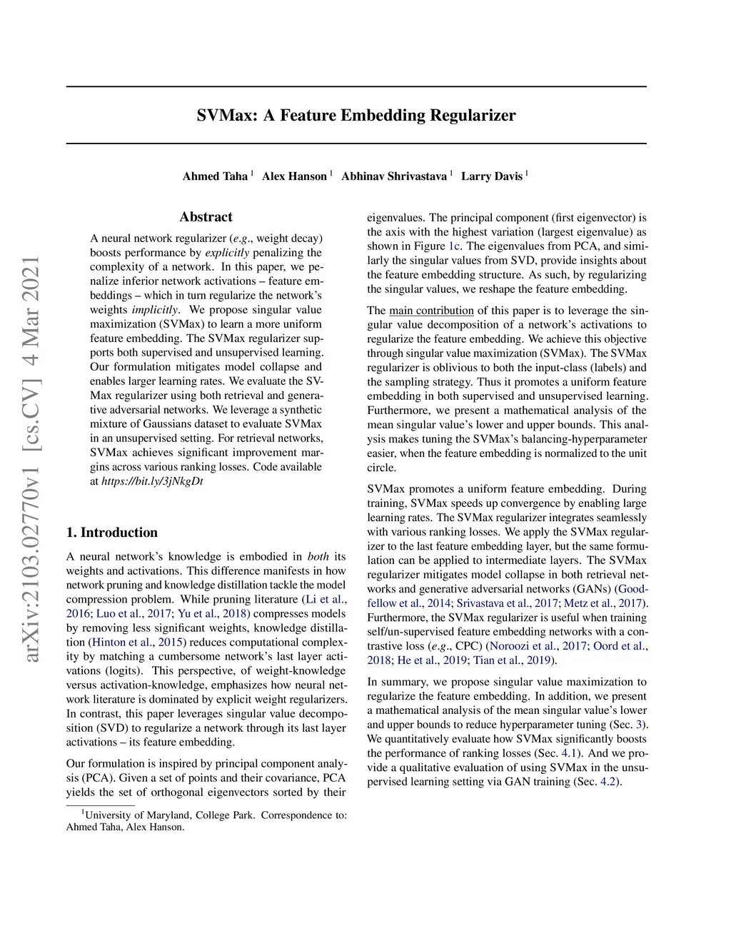 A neural network regularizer (e.g., weight decay) boosts performance by explicitly penalizing the complexity of a network. In this paper, we penalize inferior network activations -- feature embeddings -- which in turn regularize the network's weights implicitly. We propose singular value maximization (SVMax) to learn a more uniform feature embedding. The SVMax regularizer supports both supervised and unsupervised learning. Our formulation mitigates model collapse and enables larger learning rates. We evaluate the SVMax regularizer using both retrieval and generative adversarial networks. We leverage a synthetic mixture of Gaussians dataset to evaluate SVMax in an unsupervised setting. For retrieval networks, SVMax achieves significant improvement margins across various ranking losses. Code available at https://bit.ly/3jNkgDt