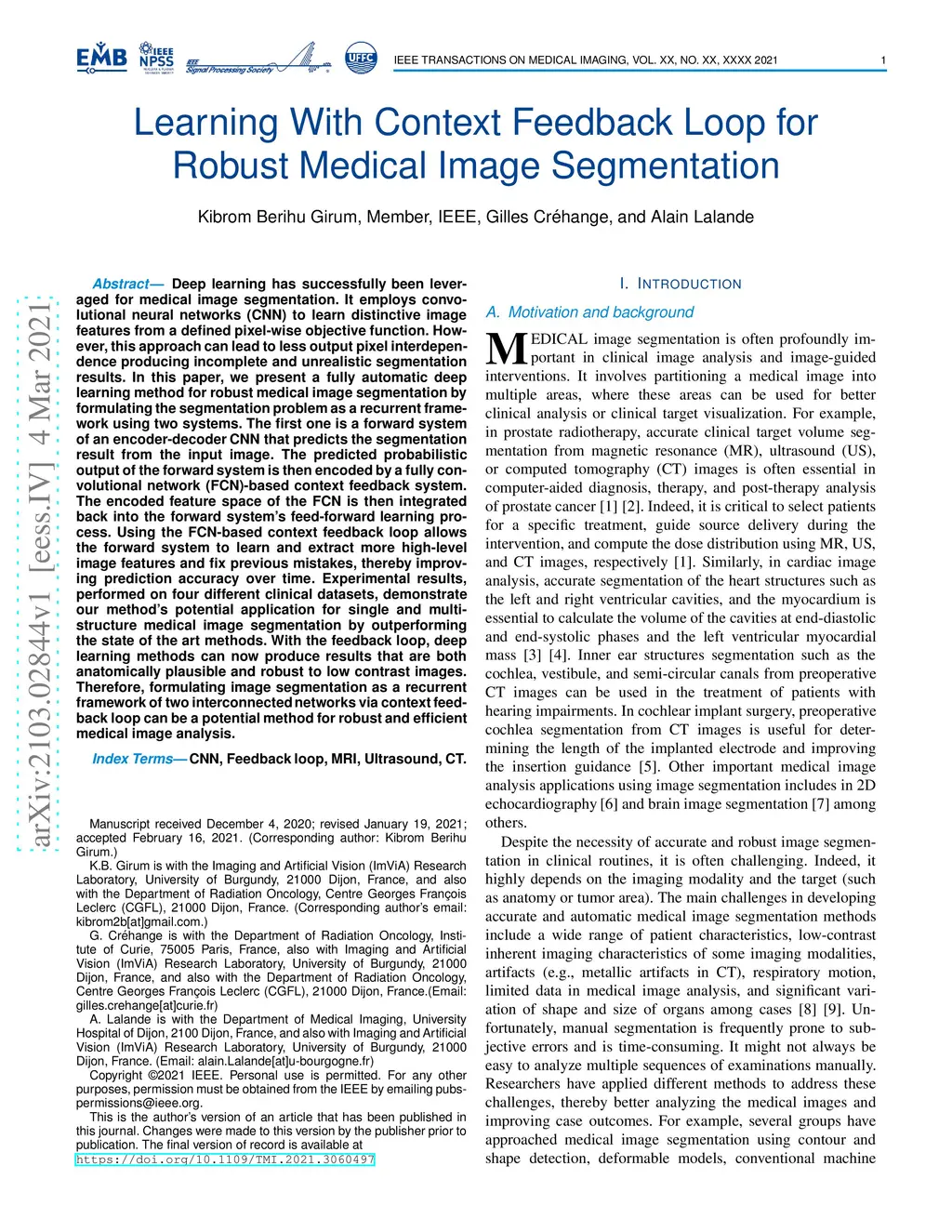 Deep learning has successfully been leveraged for medical image segmentation. It employs convolutional neural networks (CNN) to learn distinctive image features from a defined pixel-wise objective function. However, this approach can lead to less output pixel interdependence producing incomplete and unrealistic segmentation results. In this paper, we present a fully automatic deep learning method for robust medical image segmentation by formulating the segmentation problem as a recurrent framework using two systems. The first one is a forward system of an encoder-decoder CNN that predicts the segmentation result from the input image. The predicted probabilistic output of the forward system is then encoded by a fully convolutional network (FCN)-based context feedback system. The encoded feature space of the FCN is then integrated back into the forward system's feed-forward learning process. Using the FCN-based context feedback loop allows the forward system to learn and extract more high-level image features and fix previous mistakes, thereby improving prediction accuracy over time. Experimental results, performed on four different clinical datasets, demonstrate our method's potential application for single and multi-structure medical image segmentation by outperforming the state of the art methods. With the feedback loop, deep learning methods can now produce results that are both anatomically plausible and robust to low contrast images. Therefore, formulating image segmentation as a recurrent framework of two interconnected networks via context feedback loop can be a potential method for robust and efficient medical image analysis.