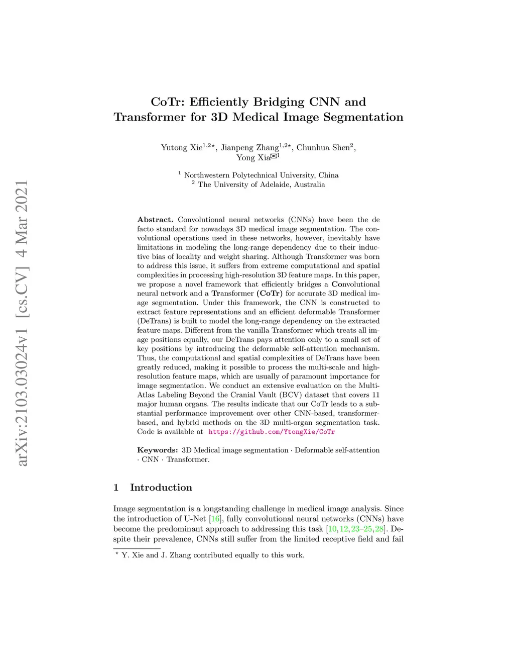 CoTr: Efficiently Bridging CNN and Transformer for 3D Medical Image