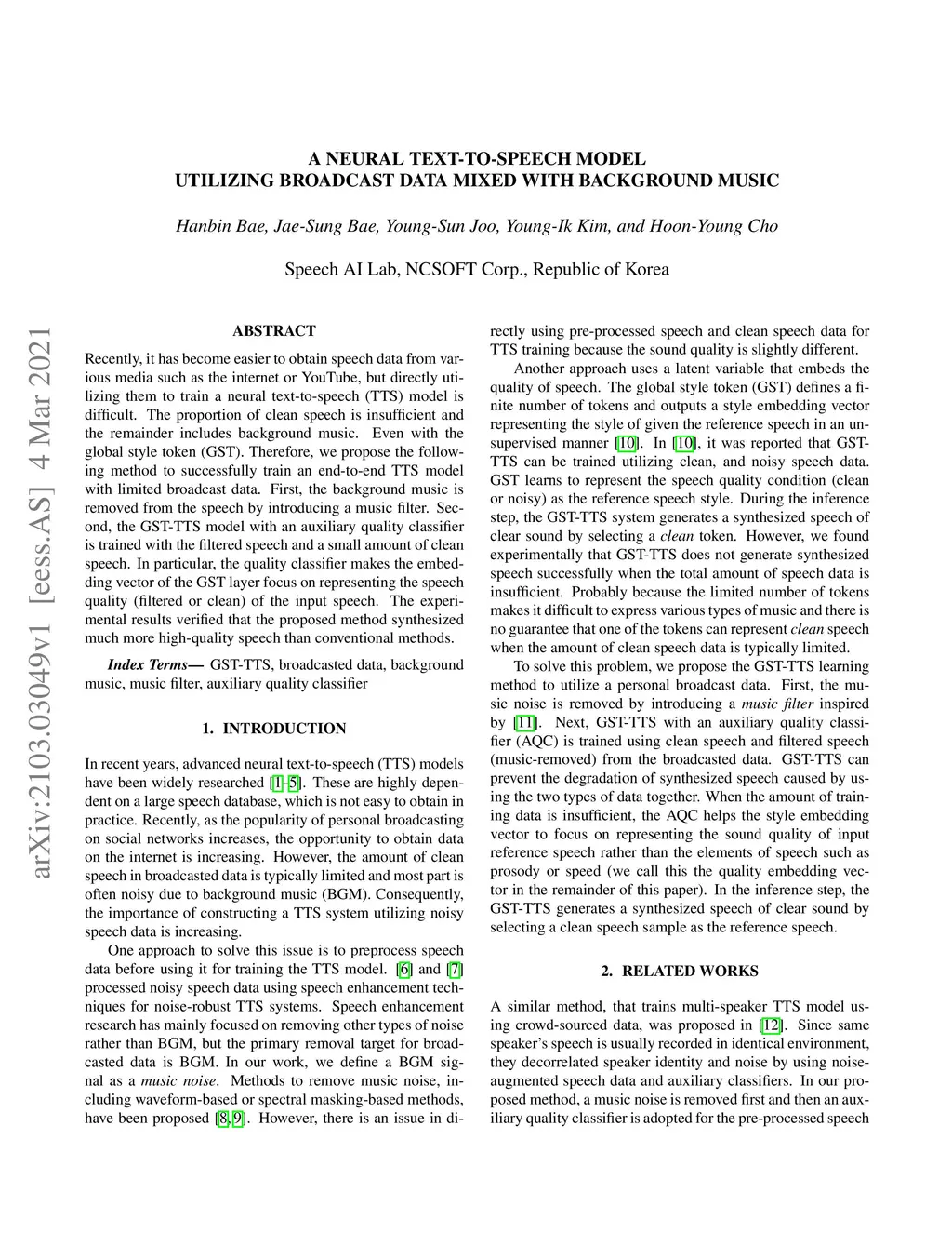 Recently, it has become easier to obtain speech data from various media such as the internet or YouTube, but directly utilizing them to train a neural text-to-speech (TTS) model is difficult. The proportion of clean speech is insufficient and the remainder includes background music. Even with the global style token (GST). Therefore, we propose the following method to successfully train an end-to-end TTS model with limited broadcast data. First, the background music is removed from the speech by introducing a music filter. Second, the GST-TTS model with an auxiliary quality classifier is trained with the filtered speech and a small amount of clean speech. In particular, the quality classifier makes the embedding vector of the GST layer focus on representing the speech quality (filtered or clean) of the input speech. The experimental results verified that the proposed method synthesized much more high-quality speech than conventional methods.