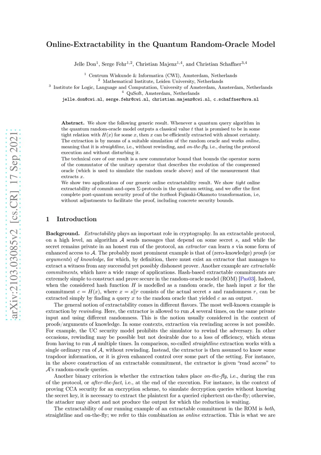We show the following generic result. Whenever a quantum query algorithm in the quantum random-oracle model outputs a classical value that is promised to be in some tight relation with for some , then can be efficiently extracted with almost certainty. The extraction is by means of a suitable simulation of the random oracle and works online, meaning that it is straightline, i.e., without rewinding, and on-the-fly, i.e., during the protocol execution and without disturbing it. The technical core of our result is a new commutator bound that bounds the operator norm of the commutator of the unitary operator that describes the evolution of the compressed oracle (which is used to simulate the random oracle above) and of the measurement that extracts . We show two applications of our generic online extractability result. We show tight online extractability of commit-and-open -protocols in the quantum setting, and we offer the first non-asymptotic post-quantum security proof of the textbook Fujisaki-Okamoto transformation, i.e, without adjustments to facilitate the proof.