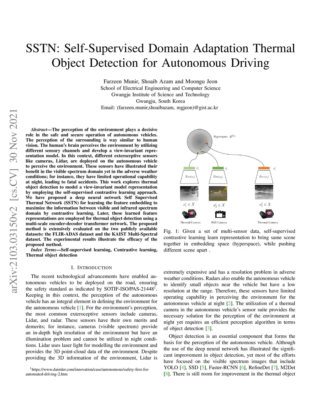 The sensibility and sensitivity of the environment play a decisive role in the safe and secure operation of autonomous vehicles. This perception of the surrounding is way similar to human visual representation. The human's brain perceives the environment by utilizing different sensory channels and develop a view-invariant representation model. Keeping in this context, different exteroceptive sensors are deployed on the autonomous vehicle for perceiving the environment. The most common exteroceptive sensors are camera, Lidar and radar for autonomous vehicle's perception. Despite being these sensors have illustrated their benefit in the visible spectrum domain yet in the adverse weather conditions, for instance, at night, they have limited operation capability, which may lead to fatal accidents. In this work, we explore thermal object detection to model a view-invariant model representation by employing the self-supervised contrastive learning approach. For this purpose, we have proposed a deep neural network Self Supervised Thermal Network (SSTN) for learning the feature embedding to maximize the information between visible and infrared spectrum domain by contrastive learning, and later employing these learned feature representation for the thermal object detection using multi-scale encoder-decoder transformer network. The proposed method is extensively evaluated on the two publicly available datasets: the FLIR-ADAS dataset and the KAIST Multi-Spectral dataset. The experimental results illustrate the efficacy of the proposed method.