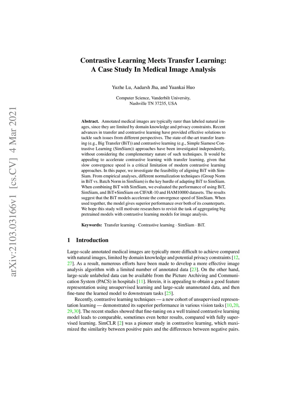 Annotated medical images are typically rarer than labeled natural images since they are limited by domain knowledge and privacy constraints. Recent advances in transfer and contrastive learning have provided effective solutions to tackle such issues from different perspectives. The state-of-the-art transfer learning (e.g., Big Transfer (BiT)) and contrastive learning (e.g., Simple Siamese Contrastive Learning (SimSiam)) approaches have been investigated independently, without considering the complementary nature of such techniques. It would be appealing to accelerate contrastive learning with transfer learning, given that slow convergence speed is a critical limitation of modern contrastive learning approaches. In this paper, we investigate the feasibility of aligning BiT with SimSiam. From empirical analyses, different normalization techniques (Group Norm in BiT vs. Batch Norm in SimSiam) are the key hurdle of adapting BiT to SimSiam. When combining BiT with SimSiam, we evaluated the performance of using BiT, SimSiam, and BiT+SimSiam on CIFAR-10 and HAM10000 datasets. The results suggest that the BiT models accelerate the convergence speed of SimSiam. When used together, the model gives superior performance over both of its counterparts. We hope this study will motivate researchers to revisit the task of aggregating big pre-trained models with contrastive learning models for image analysis.