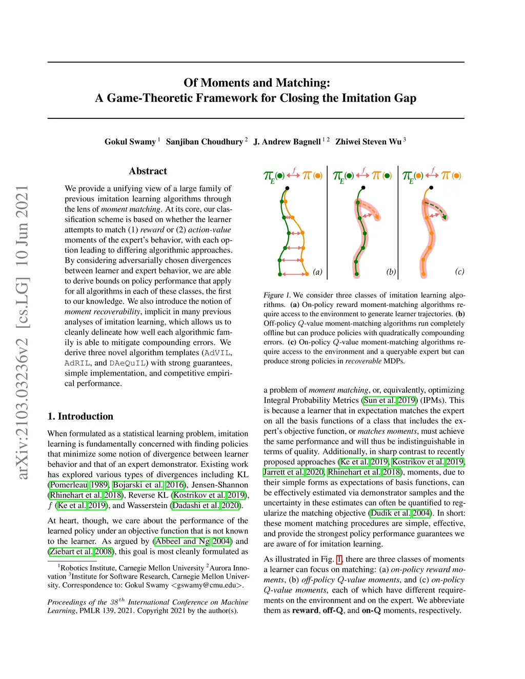 We provide a unifying view of a large family of previous imitation learning algorithms through the lens of moment matching. At its core, our classification scheme is based on whether the learner attempts to match (1) reward or (2) action-value moments of the expert's behavior, with each option leading to differing algorithmic approaches. By considering adversarially chosen divergences between learner and expert behavior, we are able to derive bounds on policy performance that apply for all algorithms in each of these classes, the first to our knowledge. We also introduce the notion of moment recoverability, implicit in many previous analyses of imitation learning, which allows us to cleanly delineate how well each algorithmic family is able to mitigate compounding errors. We derive three novel algorithm templates (AdVIL, AdRIL, and DAeQuIL) with strong guarantees, simple implementation, and competitive empirical performance.