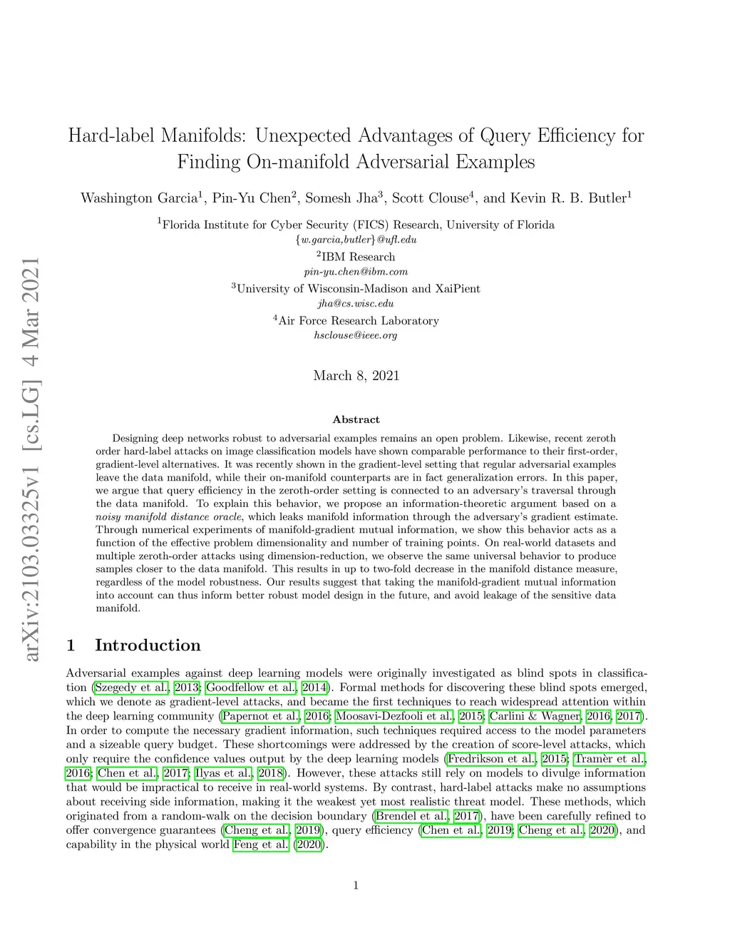 Designing deep networks robust to adversarial examples remains an open problem. Likewise, recent zeroth order hard-label attacks on image classification models have shown comparable performance to their first-order, gradient-level alternatives. It was recently shown in the gradient-level setting that regular adversarial examples leave the data manifold, while their on-manifold counterparts are in fact generalization errors. In this paper, we argue that query efficiency in the zeroth-order setting is connected to an adversary's traversal through the data manifold. To explain this behavior, we propose an information-theoretic argument based on a noisy manifold distance oracle, which leaks manifold information through the adversary's gradient estimate. Through numerical experiments of manifold-gradient mutual information, we show this behavior acts as a function of the effective problem dimensionality and number of training points. On real-world datasets and multiple zeroth-order attacks using dimension-reduction, we observe the same universal behavior to produce samples closer to the data manifold. This results in up to two-fold decrease in the manifold distance measure, regardless of the model robustness. Our results suggest that taking the manifold-gradient mutual information into account can thus inform better robust model design in the future, and avoid leakage of the sensitive data manifold.