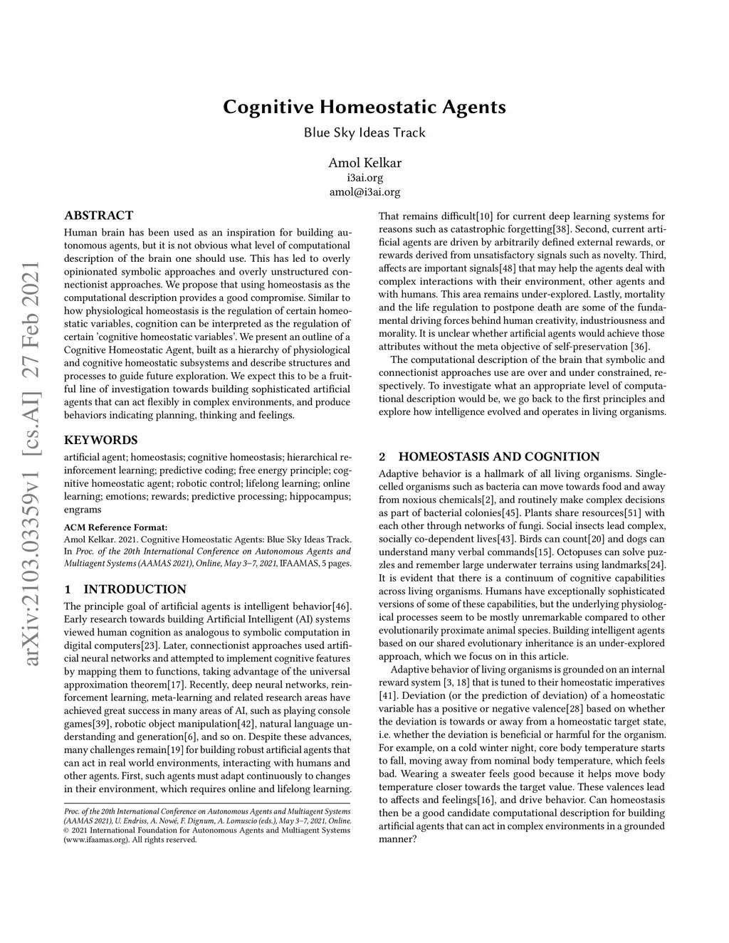 Human brain has been used as an inspiration for building autonomous agents, but it is not obvious what level of computational description of the brain one should use. This has led to overly opinionated symbolic approaches and overly unstructured connectionist approaches. We propose that using homeostasis as the computational description provides a good compromise. Similar to how physiological homeostasis is the regulation of certain homeostatic variables, cognition can be interpreted as the regulation of certain 'cognitive homeostatic variables'. We present an outline of a Cognitive Homeostatic Agent, built as a hierarchy of physiological and cognitive homeostatic subsystems and describe structures and processes to guide future exploration. We expect this to be a fruitful line of investigation towards building sophisticated artificial agents that can act flexibly in complex environments, and produce behaviors indicating planning, thinking and feelings.