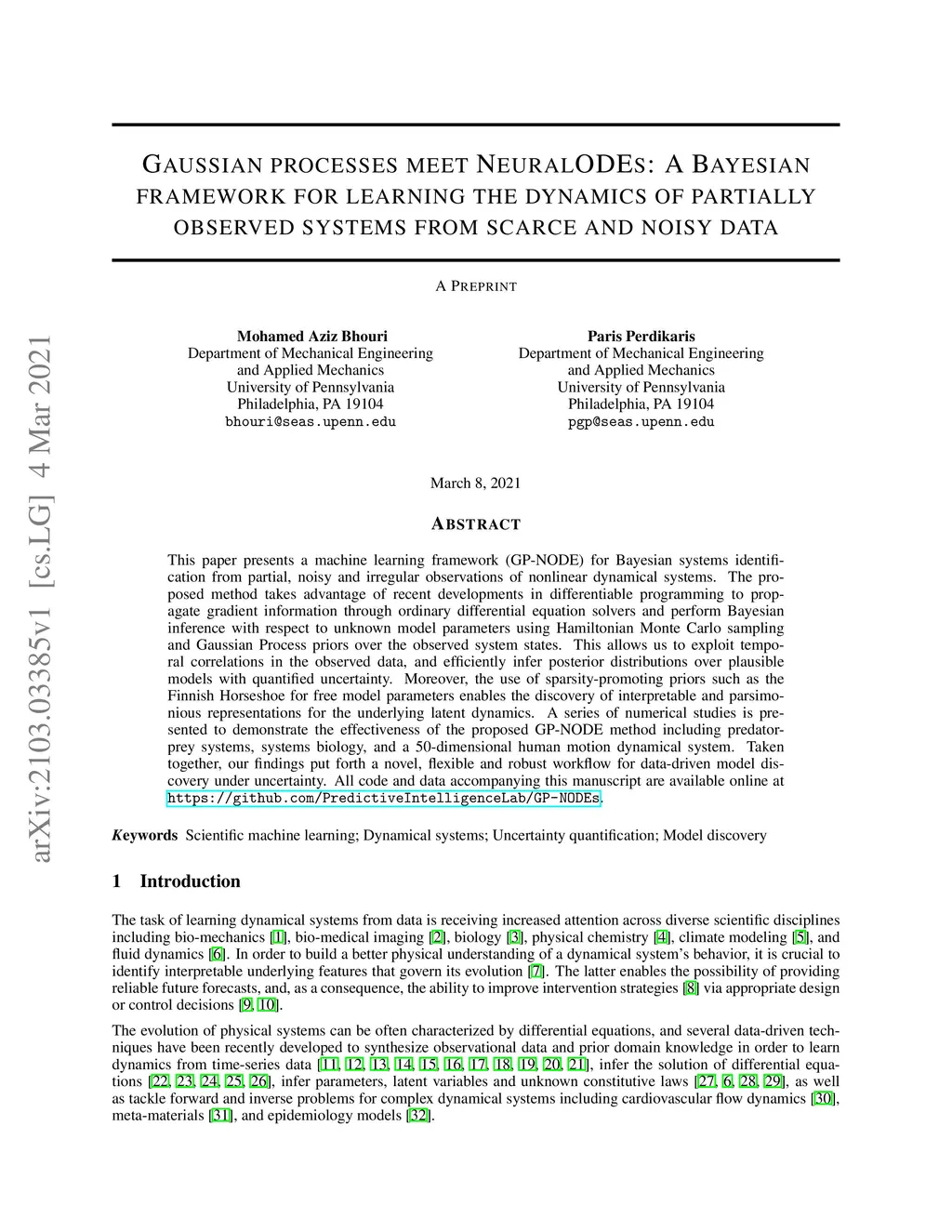 This paper presents a machine learning framework (GP-NODE) for Bayesian systems identification from partial, noisy and irregular observations of nonlinear dynamical systems. The proposed method takes advantage of recent developments in differentiable programming to propagate gradient information through ordinary differential equation solvers and perform Bayesian inference with respect to unknown model parameters using Hamiltonian Monte Carlo sampling and Gaussian Process priors over the observed system states. This allows us to exploit temporal correlations in the observed data, and efficiently infer posterior distributions over plausible models with quantified uncertainty. Moreover, the use of sparsity-promoting priors such as the Finnish Horseshoe for free model parameters enables the discovery of interpretable and parsimonious representations for the underlying latent dynamics. A series of numerical studies is presented to demonstrate the effectiveness of the proposed GP-NODE method including predator-prey systems, systems biology, and a 50-dimensional human motion dynamical system. Taken together, our findings put forth a novel, flexible and robust workflow for data-driven model discovery under uncertainty. All code and data accompanying this manuscript are available online at \url{https://github.com/PredictiveIntelligenceLab/GP-NODEs}.