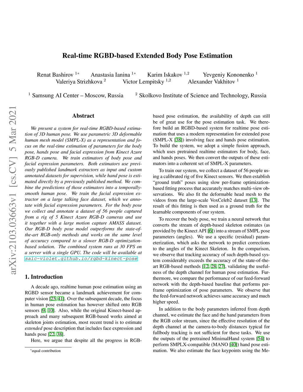 We present a system for real-time RGBD-based estimation of 3D human pose. We use parametric 3D deformable human mesh model (SMPL-X) as a representation and focus on the real-time estimation of parameters for the body pose, hands pose and facial expression from Kinect Azure RGB-D camera. We train estimators of body pose and facial expression parameters. Both estimators use previously published landmark extractors as input and custom annotated datasets for supervision, while hand pose is estimated directly by a previously published method. We combine the predictions of those estimators into a temporally-smooth human pose. We train the facial expression extractor on a large talking face dataset, which we annotate with facial expression parameters. For the body pose we collect and annotate a dataset of 56 people captured from a rig of 5 Kinect Azure RGB-D cameras and use it together with a large motion capture AMASS dataset. Our RGB-D body pose model outperforms the state-of-the-art RGB-only methods and works on the same level of accuracy compared to a slower RGB-D optimization-based solution. The combined system runs at 30 FPS on a server with a single GPU. The code will be available at https://saic-violet.github.io/rgbd-kinect-pose
