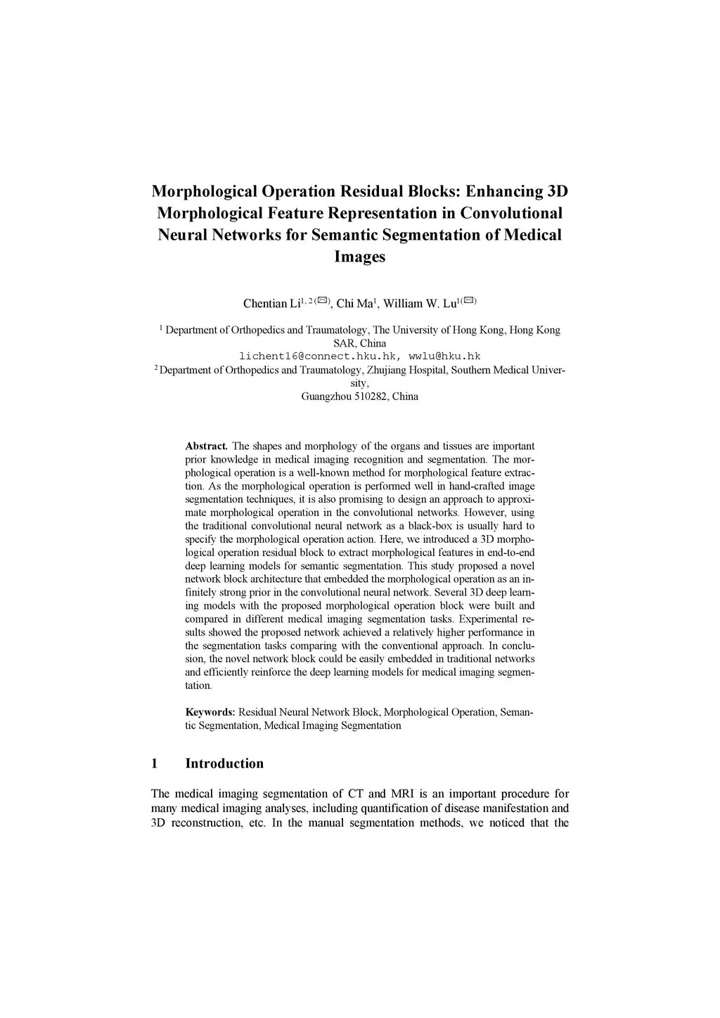 The shapes and morphology of the organs and tissues are important prior knowledge in medical imaging recognition and segmentation. The morphological operation is a well-known method for morphological feature extraction. As the morphological operation is performed well in hand-crafted image segmentation techniques, it is also promising to design an approach to approximate morphological operation in the convolutional networks. However, using the traditional convolutional neural network as a black-box is usually hard to specify the morphological operation action. Here, we introduced a 3D morphological operation residual block to extract morphological features in end-to-end deep learning models for semantic segmentation. This study proposed a novel network block architecture that embedded the morphological operation as an infinitely strong prior in the convolutional neural network. Several 3D deep learning models with the proposed morphological operation block were built and compared in different medical imaging segmentation tasks. Experimental results showed the proposed network achieved a relatively higher performance in the segmentation tasks comparing with the conventional approach. In conclusion, the novel network block could be easily embedded in traditional networks and efficiently reinforce the deep learning models for medical imaging segmentation.