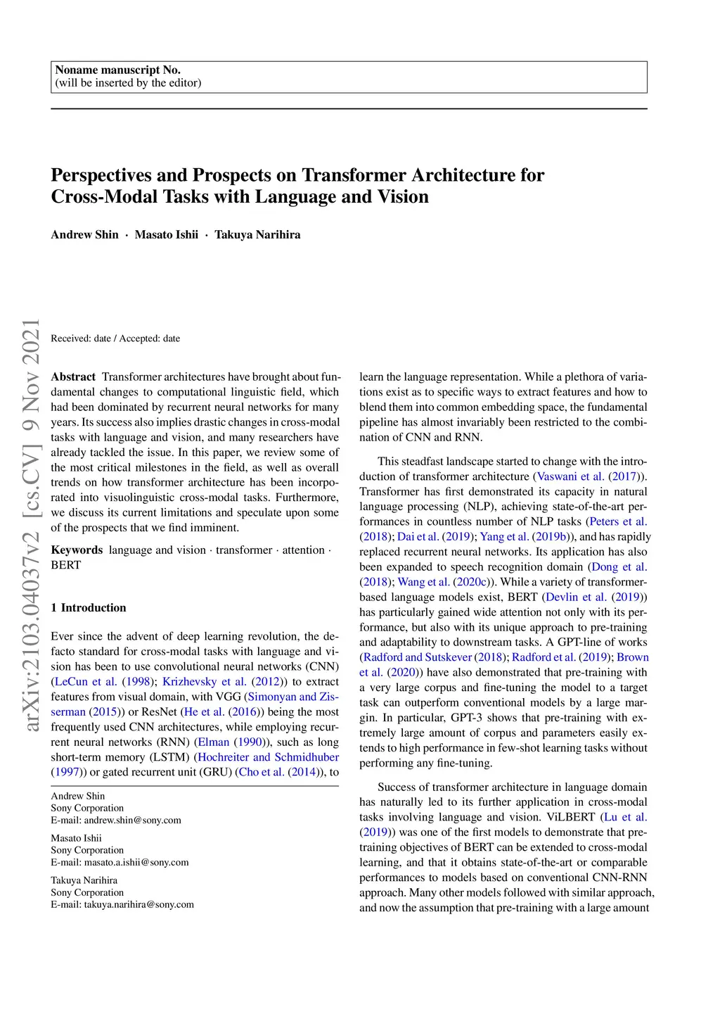 Transformer architectures have brought about fundamental changes to computational linguistic field, which had been dominated by recurrent neural networks for many years. Its success also implies drastic changes in cross-modal tasks with language and vision, and many researchers have already tackled the issue. In this paper, we review some of the most critical milestones in the field, as well as overall trends on how transformer architecture has been incorporated into visuolinguistic cross-modal tasks. Furthermore, we discuss its current limitations and speculate upon some of the prospects that we find imminent.