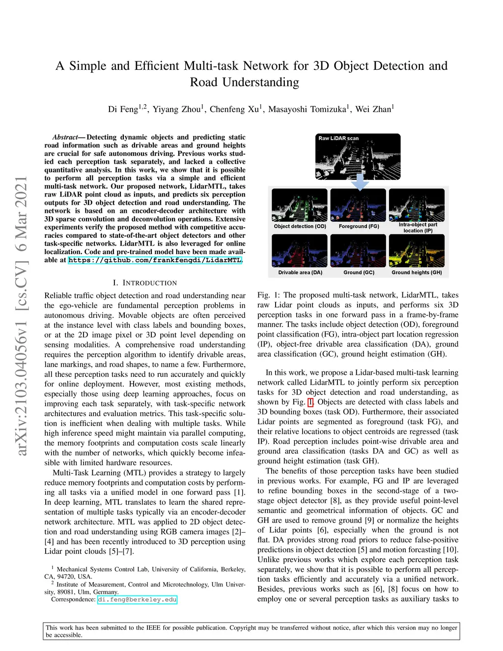 Detecting dynamic objects and predicting static road information such as drivable areas and ground heights are crucial for safe autonomous driving. Previous works studied each perception task separately, and lacked a collective quantitative analysis. In this work, we show that it is possible to perform all perception tasks via a simple and efficient multi-task network. Our proposed network, LidarMTL, takes raw LiDAR point cloud as inputs, and predicts six perception outputs for 3D object detection and road understanding. The network is based on an encoder-decoder architecture with 3D sparse convolution and deconvolution operations. Extensive experiments verify the proposed method with competitive accuracies compared to state-of-the-art object detectors and other task-specific networks. LidarMTL is also leveraged for online localization. Code and pre-trained model have been made available at https://github.com/frankfengdi/LidarMTL.
