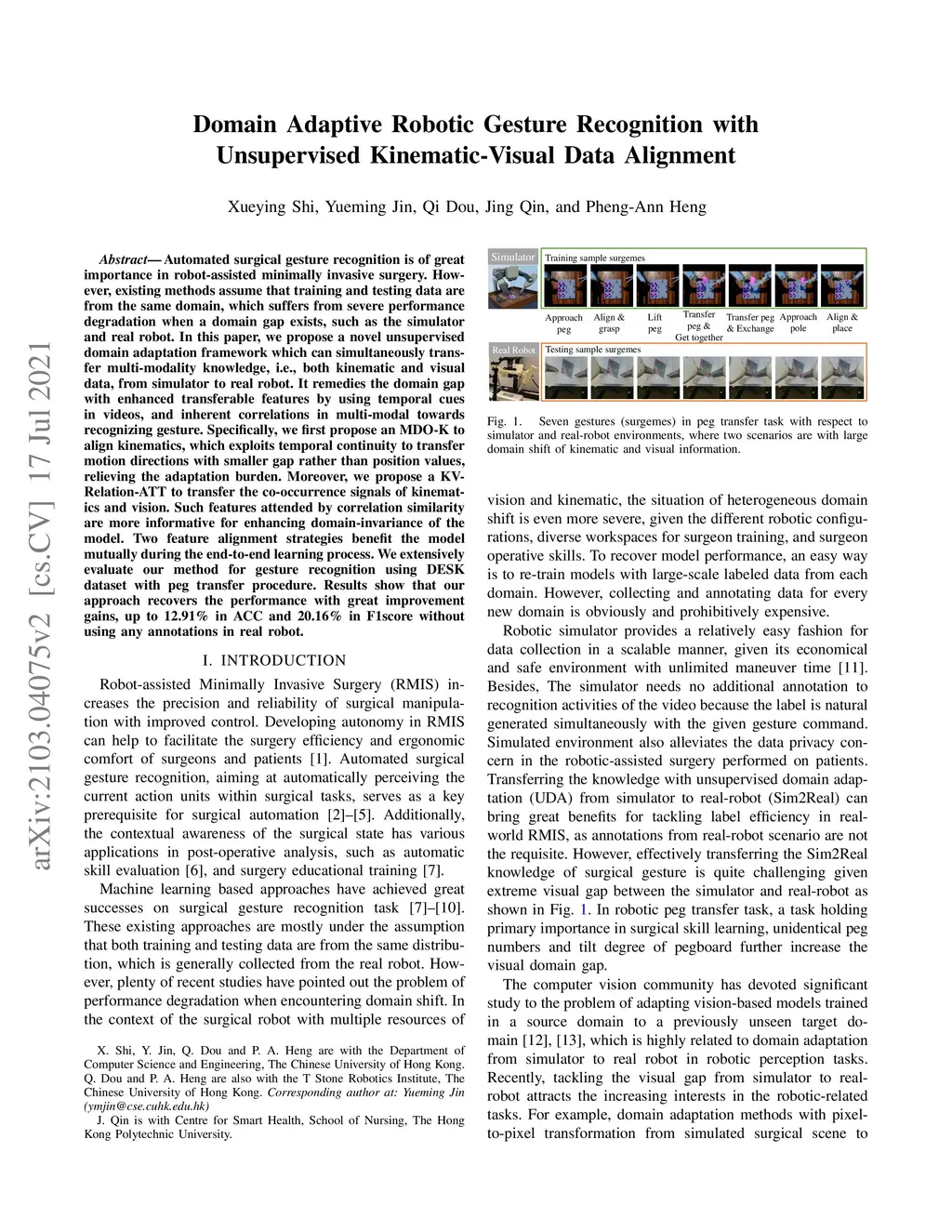 Automated surgical gesture recognition is of great importance in robot-assisted minimally invasive surgery. However, existing methods assume that training and testing data are from the same domain, which suffers from severe performance degradation when a domain gap exists, such as the simulator and real robot. In this paper, we propose a novel unsupervised domain adaptation framework which can simultaneously transfer multi-modality knowledge, i.e., both kinematic and visual data, from simulator to real robot. It remedies the domain gap with enhanced transferable features by using temporal cues in videos, and inherent correlations in multi-modal towards recognizing gesture. Specifically, we first propose an MDO-K to align kinematics, which exploits temporal continuity to transfer motion directions with smaller gap rather than position values, relieving the adaptation burden. Moreover, we propose a KV-Relation-ATT to transfer the co-occurrence signals of kinematics and vision. Such features attended by correlation similarity are more informative for enhancing domain-invariance of the model. Two feature alignment strategies benefit the model mutually during the end-to-end learning process. We extensively evaluate our method for gesture recognition using DESK dataset with peg transfer procedure. Results show that our approach recovers the performance with great improvement gains, up to 12.91% in ACC and 20.16% in F1score without using any annotations in real robot.