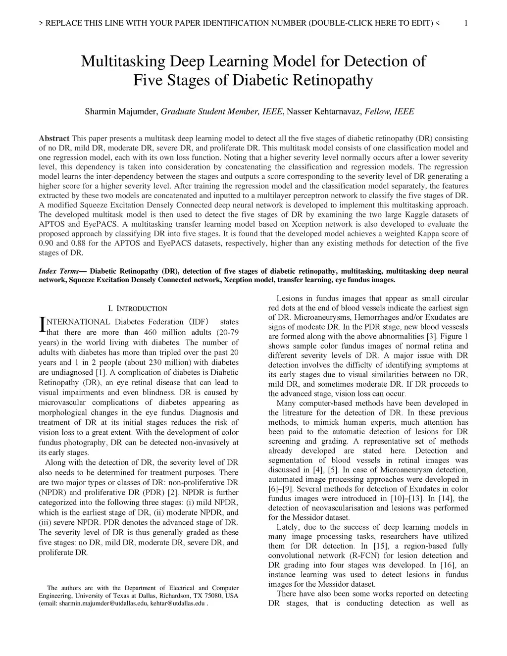 This paper presents a multitask deep learning model to detect all the five stages of diabetic retinopathy (DR) consisting of no DR, mild DR, moderate DR, severe DR, and proliferate DR. This multitask model consists of one classification model and one regression model, each with its own loss function. Noting that a higher severity level normally occurs after a lower severity level, this dependency is taken into consideration by concatenating the classification and regression models. The regression model learns the inter-dependency between the stages and outputs a score corresponding to the severity level of DR generating a higher score for a higher severity level. After training the regression model and the classification model separately, the features extracted by these two models are concatenated and inputted to a multilayer perceptron network to classify the five stages of DR. A modified Squeeze Excitation Densely Connected deep neural network is developed to implement this multitasking approach. The developed multitask model is then used to detect the five stages of DR by examining the two large Kaggle datasets of APTOS and EyePACS. A multitasking transfer learning model based on Xception network is also developed to evaluate the proposed approach by classifying DR into five stages. It is found that the developed model achieves a weighted Kappa score of 0.90 and 0.88 for the APTOS and EyePACS datasets, respectively, higher than any existing methods for detection of the five stages of DR