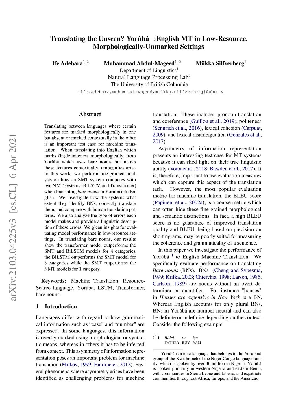Translating between languages where certain features are marked morphologically in one but absent or marked contextually in the other is an important test case for machine translation. When translating into English which marks (in)definiteness morphologically, from Yor\`ub\á which uses bare nouns but marks these features contextually, ambiguities arise. In this work, we perform fine-grained analysis on how an SMT system compares with two NMT systems (BiLSTM and Transformer) when translating bare nouns in Yor\`ub\á into English. We investigate how the systems what extent they identify BNs, correctly translate them, and compare with human translation patterns. We also analyze the type of errors each model makes and provide a linguistic description of these errors. We glean insights for evaluating model performance in low-resource settings. In translating bare nouns, our results show the transformer model outperforms the SMT and BiLSTM models for 4 categories, the BiLSTM outperforms the SMT model for 3 categories while the SMT outperforms the NMT models for 1 category.