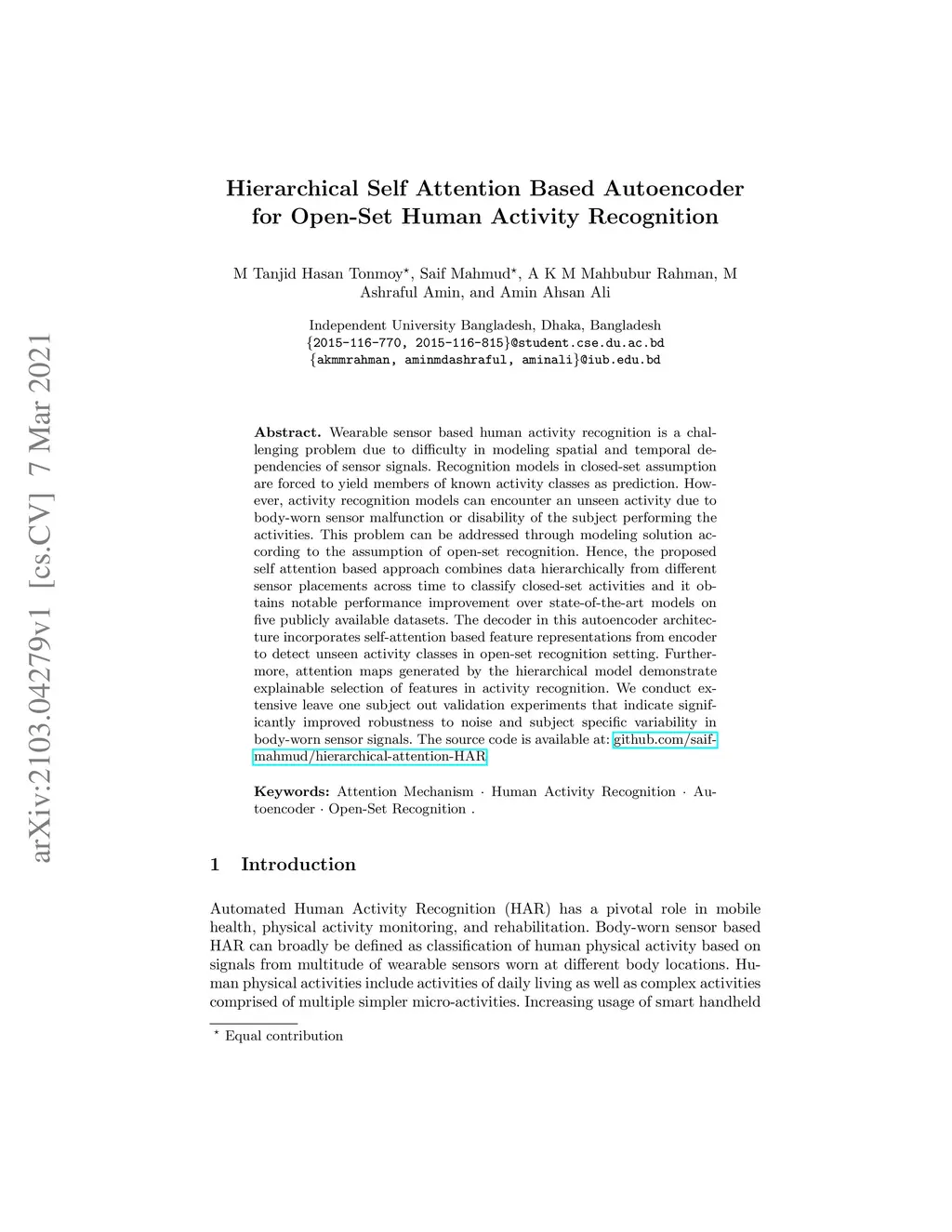 Wearable sensor based human activity recognition is a challenging problem due to difficulty in modeling spatial and temporal dependencies of sensor signals. Recognition models in closed-set assumption are forced to yield members of known activity classes as prediction. However, activity recognition models can encounter an unseen activity due to body-worn sensor malfunction or disability of the subject performing the activities. This problem can be addressed through modeling solution according to the assumption of open-set recognition. Hence, the proposed self attention based approach combines data hierarchically from different sensor placements across time to classify closed-set activities and it obtains notable performance improvement over state-of-the-art models on five publicly available datasets. The decoder in this autoencoder architecture incorporates self-attention based feature representations from encoder to detect unseen activity classes in open-set recognition setting. Furthermore, attention maps generated by the hierarchical model demonstrate explainable selection of features in activity recognition. We conduct extensive leave one subject out validation experiments that indicate significantly improved robustness to noise and subject specific variability in body-worn sensor signals. The source code is available at: github.com/saif-mahmud/hierarchical-attention-HAR