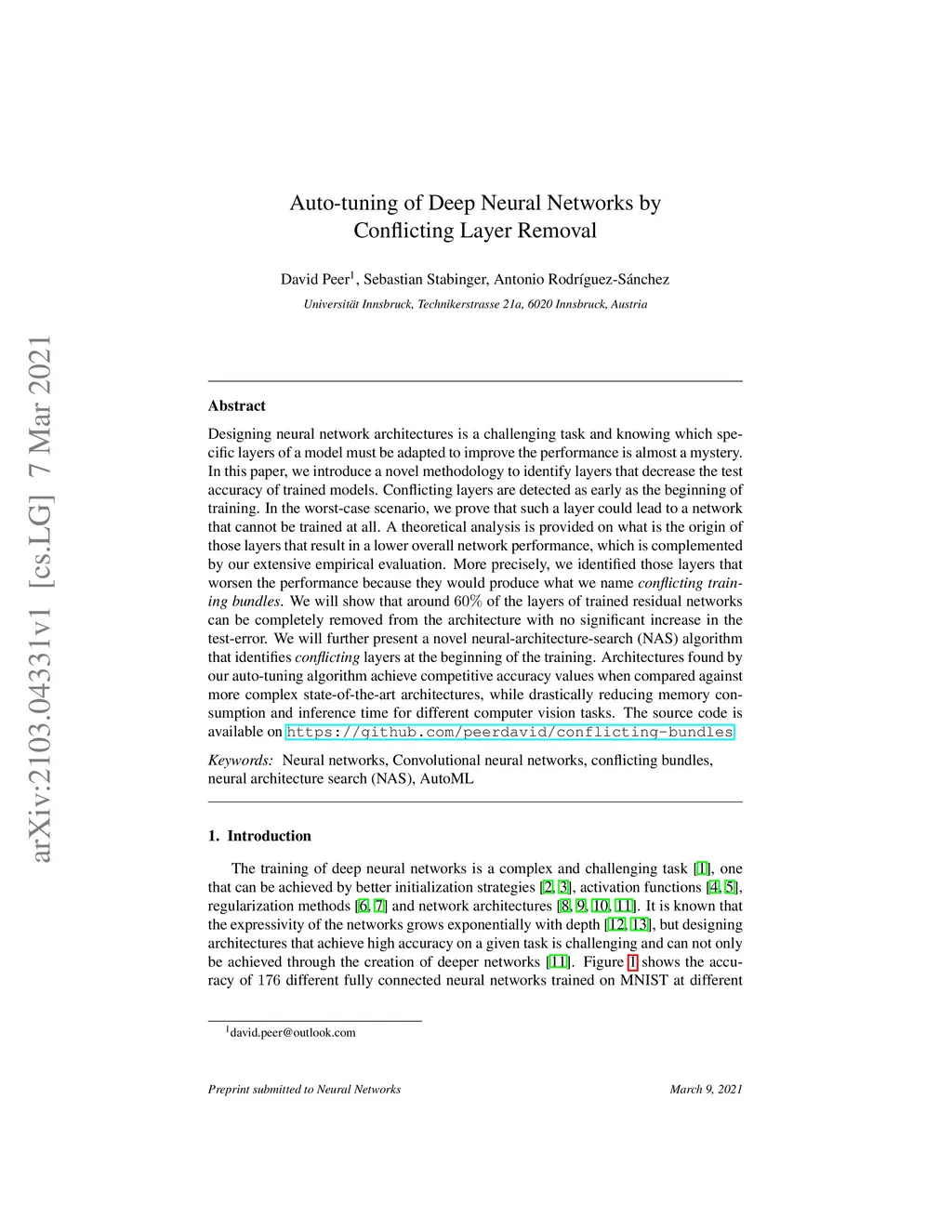 Designing neural network architectures is a challenging task and knowing which specific layers of a model must be adapted to improve the performance is almost a mystery. In this paper, we introduce a novel methodology to identify layers that decrease the test accuracy of trained models. Conflicting layers are detected as early as the beginning of training. In the worst-case scenario, we prove that such a layer could lead to a network that cannot be trained at all. A theoretical analysis is provided on what is the origin of those layers that result in a lower overall network performance, which is complemented by our extensive empirical evaluation. More precisely, we identified those layers that worsen the performance because they would produce what we name conflicting training bundles. We will show that around 60% of the layers of trained residual networks can be completely removed from the architecture with no significant increase in the test-error. We will further present a novel neural-architecture-search (NAS) algorithm that identifies conflicting layers at the beginning of the training. Architectures found by our auto-tuning algorithm achieve competitive accuracy values when compared against more complex state-of-the-art architectures, while drastically reducing memory consumption and inference time for different computer vision tasks. The source code is available on https://github.com/peerdavid/conflicting-bundles