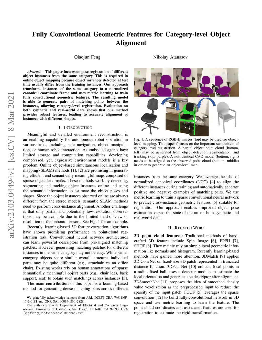 This paper focuses on pose registration of different object instances from the same category. This is required in online object mapping because object instances detected at test time usually differ from the training instances. Our approach transforms instances of the same category to a normalized canonical coordinate frame and uses metric learning to train fully convolutional geometric features. The resulting model is able to generate pairs of matching points between the instances, allowing category-level registration. Evaluation on both synthetic and real-world data shows that our method provides robust features, leading to accurate alignment of instances with different shapes.