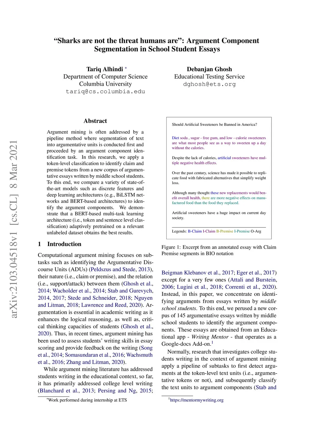 Argument mining is often addressed by a pipeline method where segmentation of text into argumentative units is conducted first and proceeded by an argument component identification task. In this research, we apply a token-level classification to identify claim and premise tokens from a new corpus of argumentative essays written by middle school students. To this end, we compare a variety of state-of-the-art models such as discrete features and deep learning architectures (e.g., BiLSTM networks and BERT-based architectures) to identify the argument components. We demonstrate that a BERT-based multi-task learning architecture (i.e., token and sentence level classification) adaptively pretrained on a relevant unlabeled dataset obtains the best results