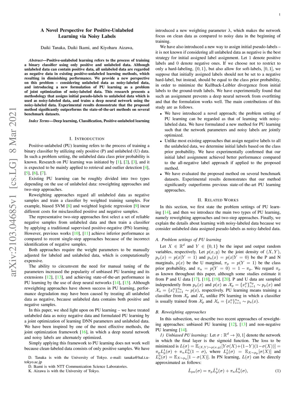 Positive-unlabeled learning refers to the process of training a binary classifier using only positive and unlabeled data. Although unlabeled data can contain positive data, all unlabeled data are regarded as negative data in existing positive-unlabeled learning methods, which resulting in diminishing performance. We provide a new perspective on this problem -- considering unlabeled data as noisy-labeled data, and introducing a new formulation of PU learning as a problem of joint optimization of noisy-labeled data. This research presents a methodology that assigns initial pseudo-labels to unlabeled data which is used as noisy-labeled data, and trains a deep neural network using the noisy-labeled data. Experimental results demonstrate that the proposed method significantly outperforms the state-of-the-art methods on several benchmark datasets.