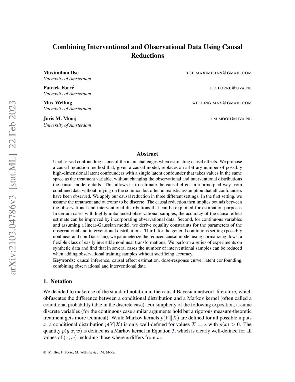 Unobserved confounding is one of the main challenges when estimating causal effects. We propose a causal reduction method that, given a causal model, replaces an arbitrary number of possibly high-dimensional latent confounders with a single latent confounder that takes values in the same space as the treatment variable, without changing the observational and interventional distributions the causal model entails. This allows us to estimate the causal effect in a principled way from combined data without relying on the common but often unrealistic assumption that all confounders have been observed. We apply our causal reduction in three different settings. In the first setting, we assume the treatment and outcome to be discrete. The causal reduction then implies bounds between the observational and interventional distributions that can be exploited for estimation purposes. In certain cases with highly unbalanced observational samples, the accuracy of the causal effect estimate can be improved by incorporating observational data. Second, for continuous variables and assuming a linear-Gaussian model, we derive equality constraints for the parameters of the observational and interventional distributions. Third, for the general continuous setting (possibly nonlinear and non-Gaussian), we parameterize the reduced causal model using normalizing flows, a flexible class of easily invertible nonlinear transformations. We perform a series of experiments on synthetic data and find that in several cases the number of interventional samples can be reduced when adding observational training samples without sacrificing accuracy.