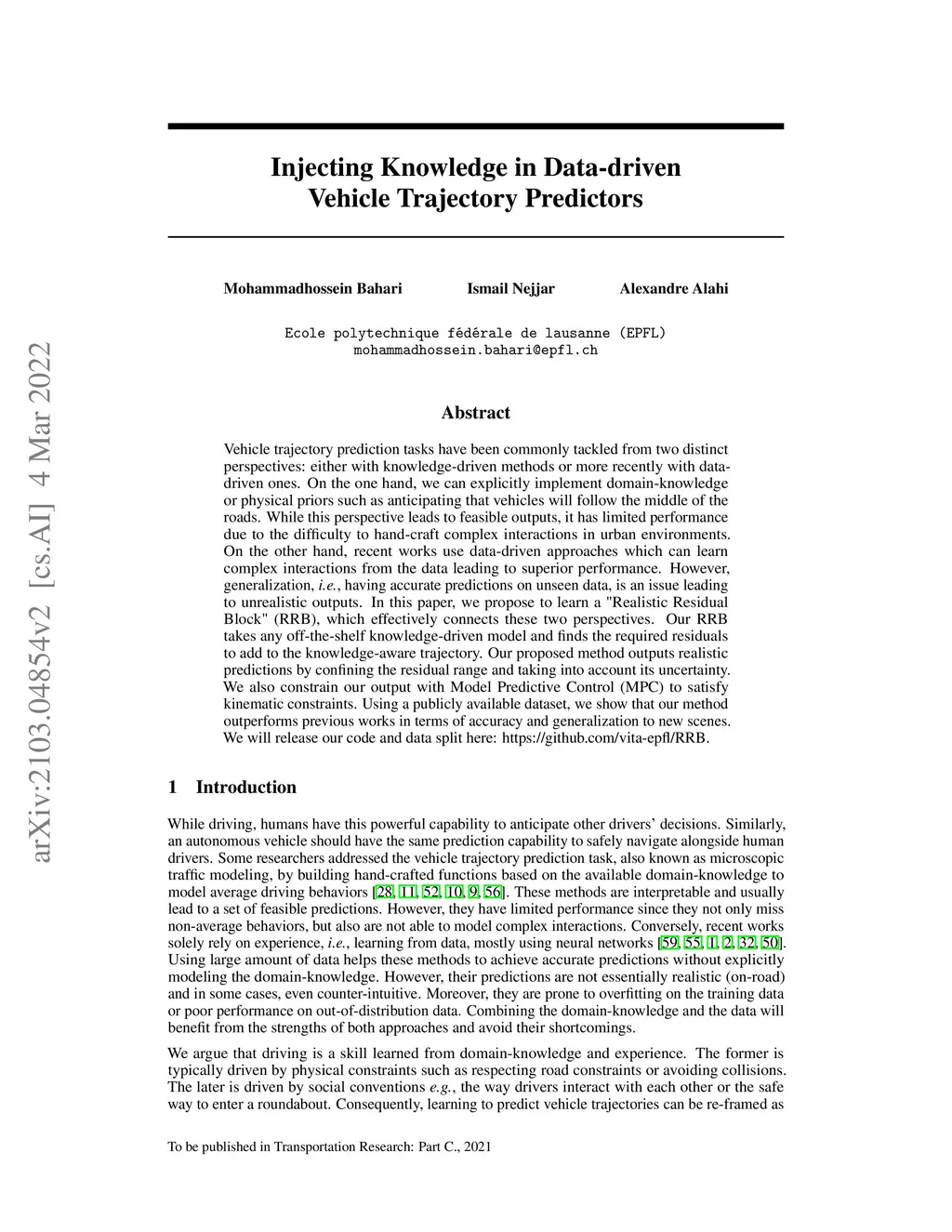 Vehicle trajectory prediction tasks have been commonly tackled from two distinct perspectives: either with knowledge-driven methods or more recently with data-driven ones. On the one hand, we can explicitly implement domain-knowledge or physical priors such as anticipating that vehicles will follow the middle of the roads. While this perspective leads to feasible outputs, it has limited performance due to the difficulty to hand-craft complex interactions in urban environments. On the other hand, recent works use data-driven approaches which can learn complex interactions from the data leading to superior performance. However, generalization, \textit{i.e.}, having accurate predictions on unseen data, is an issue leading to unrealistic outputs. In this paper, we propose to learn a "Realistic Residual Block" (RRB), which effectively connects these two perspectives. Our RRB takes any off-the-shelf knowledge-driven model and finds the required residuals to add to the knowledge-aware trajectory. Our proposed method outputs realistic predictions by confining the residual range and taking into account its uncertainty. We also constrain our output with Model Predictive Control (MPC) to satisfy kinematic constraints. Using a publicly available dataset, we show that our method outperforms previous works in terms of accuracy and generalization to new scenes. We will release our code and data split here: https://github.com/vita-epfl/RRB.