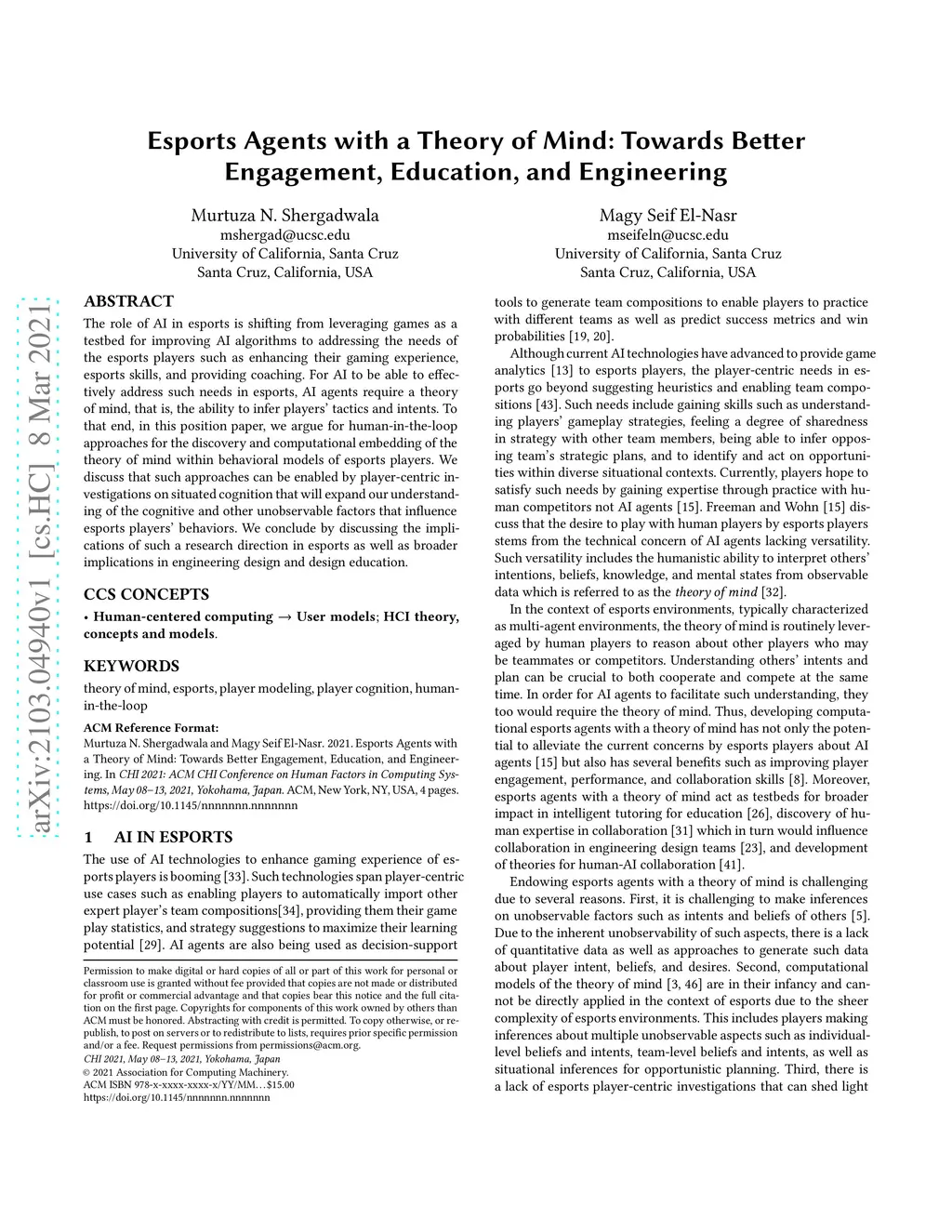 The role of AI in esports is shifting from leveraging games as a testbed for improving AI algorithms to addressing the needs of the esports players such as enhancing their gaming experience, esports skills, and providing coaching. For AI to be able to effectively address such needs in esports, AI agents require a theory of mind, that is, the ability to infer players' tactics and intents. To that end, in this position paper, we argue for human-in-the-loop approaches for the discovery and computational embedding of the theory of mind within behavioral models of esports players. We discuss that such approaches can be enabled by player-centric investigations on situated cognition that will expand our understanding of the cognitive and other unobservable factors that influence esports players' behaviors. We conclude by discussing the implications of such a research direction in esports as well as broader implications in engineering design and design education.