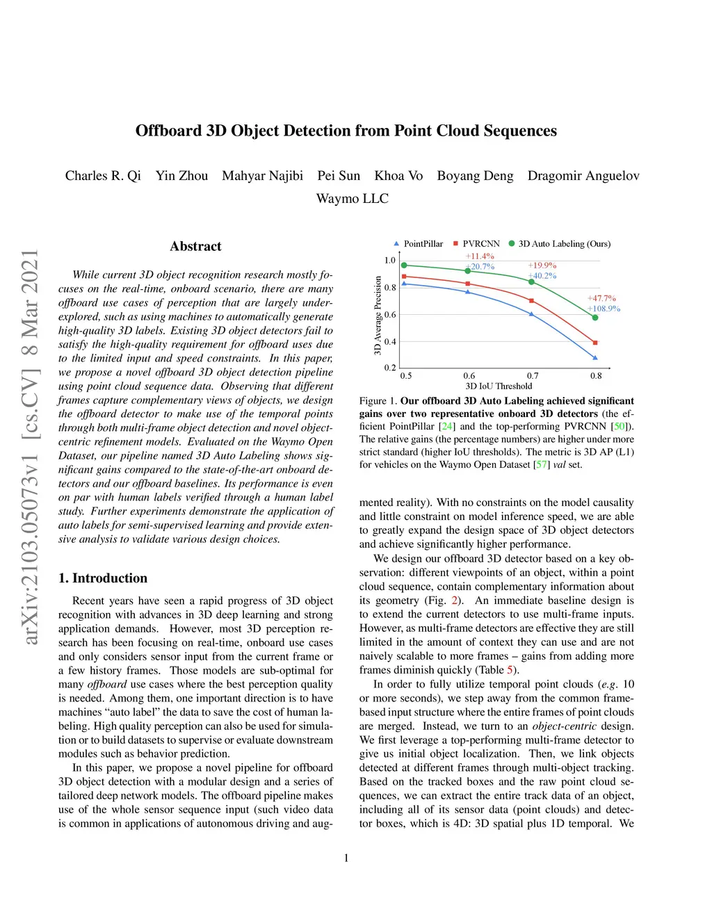 While current 3D object recognition research mostly focuses on the real-time, onboard scenario, there are many offboard use cases of perception that are largely under-explored, such as using machines to automatically generate high-quality 3D labels. Existing 3D object detectors fail to satisfy the high-quality requirement for offboard uses due to the limited input and speed constraints. In this paper, we propose a novel offboard 3D object detection pipeline using point cloud sequence data. Observing that different frames capture complementary views of objects, we design the offboard detector to make use of the temporal points through both multi-frame object detection and novel object-centric refinement models. Evaluated on the Waymo Open Dataset, our pipeline named 3D Auto Labeling shows significant gains compared to the state-of-the-art onboard detectors and our offboard baselines. Its performance is even on par with human labels verified through a human label study. Further experiments demonstrate the application of auto labels for semi-supervised learning and provide extensive analysis to validate various design choices.