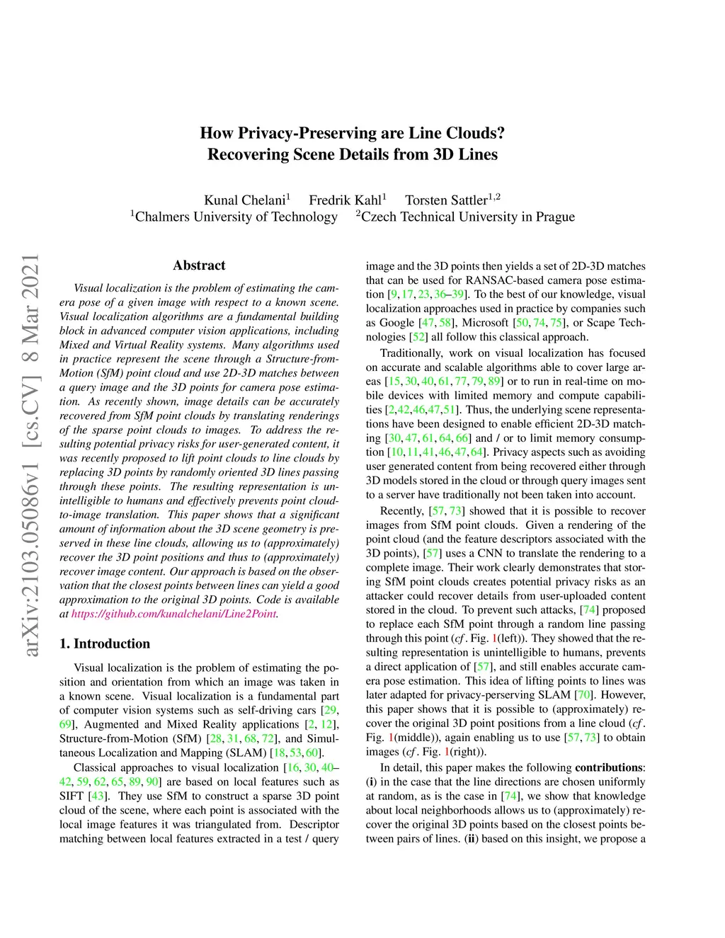 Visual localization is the problem of estimating the camera pose of a given image with respect to a known scene. Visual localization algorithms are a fundamental building block in advanced computer vision applications, including Mixed and Virtual Reality systems. Many algorithms used in practice represent the scene through a Structure-from-Motion (SfM) point cloud and use 2D-3D matches between a query image and the 3D points for camera pose estimation. As recently shown, image details can be accurately recovered from SfM point clouds by translating renderings of the sparse point clouds to images. To address the resulting potential privacy risks for user-generated content, it was recently proposed to lift point clouds to line clouds by replacing 3D points by randomly oriented 3D lines passing through these points. The resulting representation is unintelligible to humans and effectively prevents point cloud-to-image translation. This paper shows that a significant amount of information about the 3D scene geometry is preserved in these line clouds, allowing us to (approximately) recover the 3D point positions and thus to (approximately) recover image content. Our approach is based on the observation that the closest points between lines can yield a good approximation to the original 3D points. Code is available at https://github.com/kunalchelani/Line2Point.