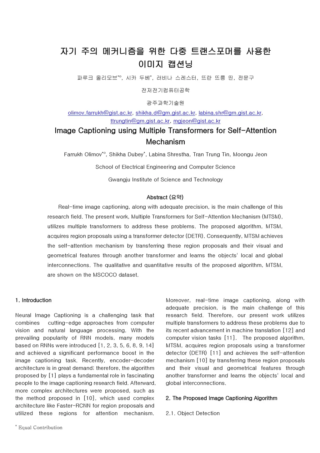 Real-time image captioning, along with adequate precision, is the main challenge of this research field. The present work, Multiple Transformers for Self-Attention Mechanism (MTSM), utilizes multiple transformers to address these problems. The proposed algorithm, MTSM, acquires region proposals using a transformer detector (DETR). Consequently, MTSM achieves the self-attention mechanism by transferring these region proposals and their visual and geometrical features through another transformer and learns the objects' local and global interconnections. The qualitative and quantitative results of the proposed algorithm, MTSM, are shown on the MSCOCO dataset.