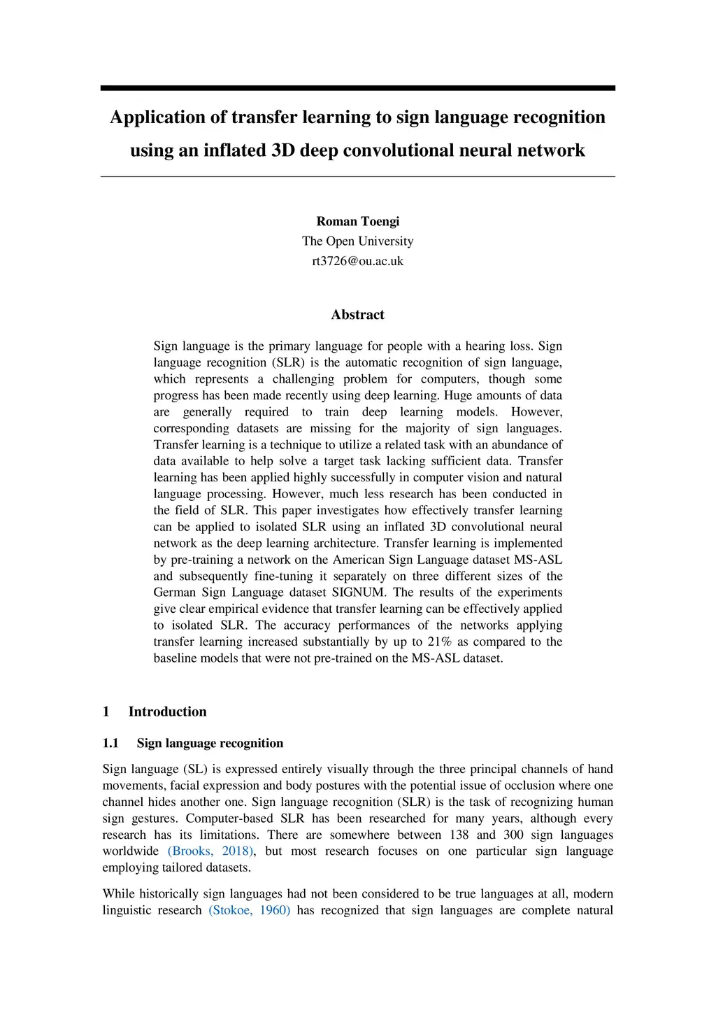 Application of Transfer Learning to Sign Language Recognition using an