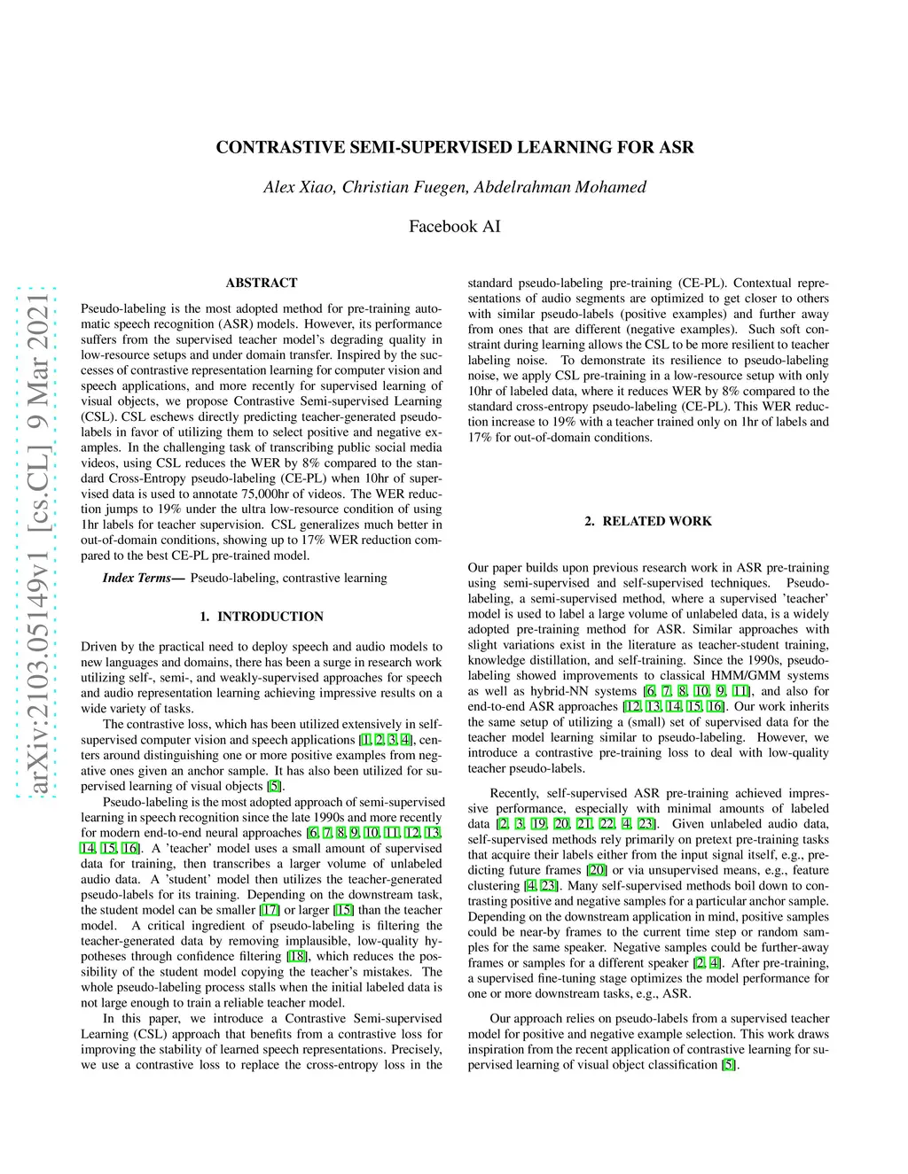 Pseudo-labeling is the most adopted method for pre-training automatic speech recognition (ASR) models. However, its performance suffers from the supervised teacher model's degrading quality in low-resource setups and under domain transfer. Inspired by the successes of contrastive representation learning for computer vision and speech applications, and more recently for supervised learning of visual objects, we propose Contrastive Semi-supervised Learning (CSL). CSL eschews directly predicting teacher-generated pseudo-labels in favor of utilizing them to select positive and negative examples. In the challenging task of transcribing public social media videos, using CSL reduces the WER by 8% compared to the standard Cross-Entropy pseudo-labeling (CE-PL) when 10hr of supervised data is used to annotate 75,000hr of videos. The WER reduction jumps to 19% under the ultra low-resource condition of using 1hr labels for teacher supervision. CSL generalizes much better in out-of-domain conditions, showing up to 17% WER reduction compared to the best CE-PL pre-trained model.