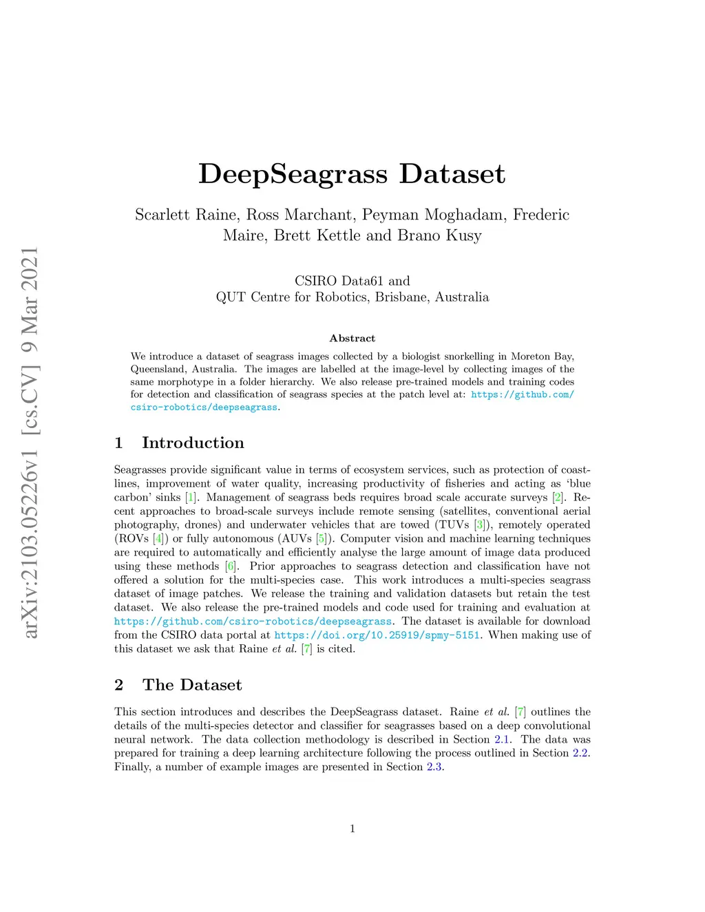 We introduce a dataset of seagrass images collected by a biologist snorkelling in Moreton Bay, Queensland, Australia, as described in our publication: arXiv:2009.09924. The images are labelled at the image-level by collecting images of the same morphotype in a folder hierarchy. We also release pre-trained models and training codes for detection and classification of seagrass species at the patch level at https://github.com/csiro-robotics/deepseagrass.