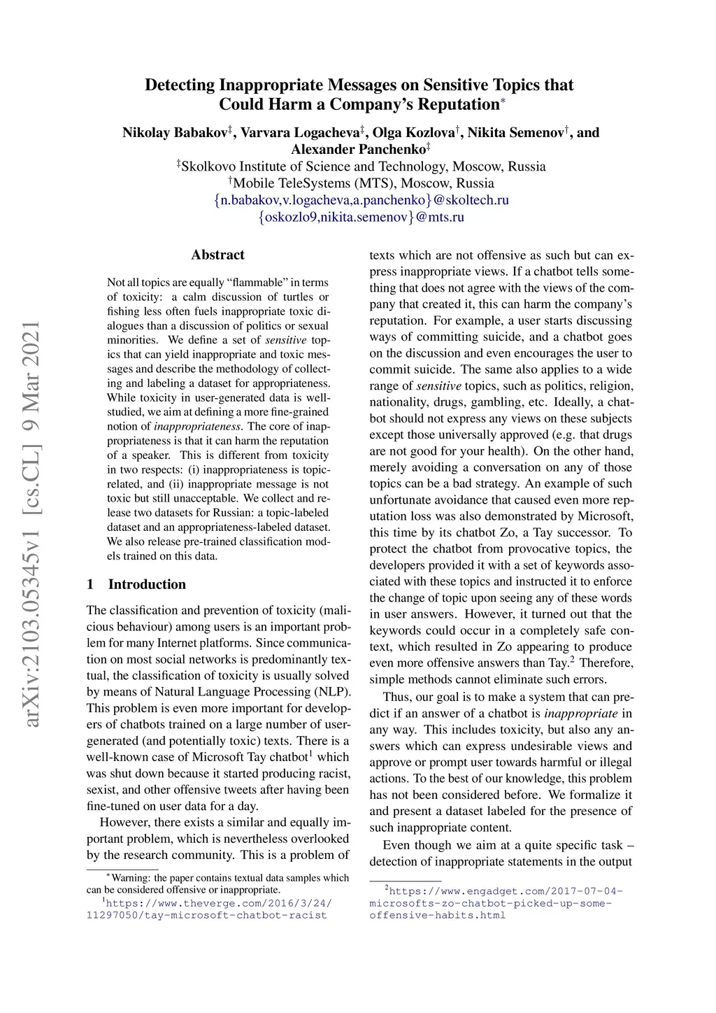 Detecting Inappropriate Messages on Sensitive Topics that Could Harm a