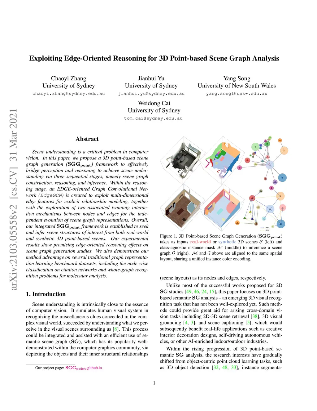 Scene understanding is a critical problem in computer vision. In this paper, we propose a 3D point-based scene graph generation () framework to effectively bridge perception and reasoning to achieve scene understanding via three sequential stages, namely scene graph construction, reasoning, and inference. Within the reasoning stage, an EDGE-oriented Graph Convolutional Network () is created to exploit multi-dimensional edge features for explicit relationship modeling, together with the exploration of two associated twinning interaction mechanisms between nodes and edges for the independent evolution of scene graph representations. Overall, our integrated framework is established to seek and infer scene structures of interest from both real-world and synthetic 3D point-based scenes. Our experimental results show promising edge-oriented reasoning effects on scene graph generation studies. We also demonstrate our method advantage on several traditional graph representation learning benchmark datasets, including the node-wise classification on citation networks and whole-graph recognition problems for molecular analysis.