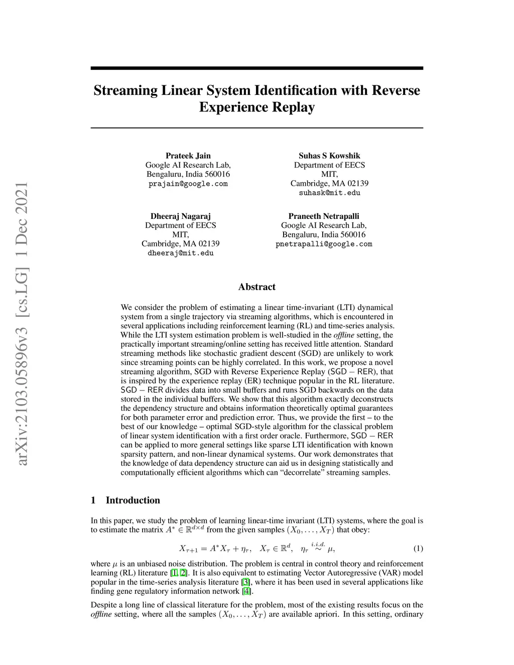 We consider the problem of estimating a linear time-invariant (LTI) dynamical system from a single trajectory via streaming algorithms, which is encountered in several applications including reinforcement learning (RL) and time-series analysis. While the LTI system estimation problem is well-studied in the {\em offline} setting, the practically important streaming/online setting has received little attention. Standard streaming methods like stochastic gradient descent (SGD) are unlikely to work since streaming points can be highly correlated. In this work, we propose a novel streaming algorithm, SGD with Reverse Experience Replay (), that is inspired by the experience replay (ER) technique popular in the RL literature. divides data into small buffers and runs SGD backwards on the data stored in the individual buffers. We show that this algorithm exactly deconstructs the dependency structure and obtains information theoretically optimal guarantees for both parameter error and prediction error. Thus, we provide the first -- to the best of our knowledge -- optimal SGD-style algorithm for the classical problem of linear system identification with a first order oracle. Furthermore, can be applied to more general settings like sparse LTI identification with known sparsity pattern, and non-linear dynamical systems. Our work demonstrates that the knowledge of data dependency structure can aid us in designing statistically and computationally efficient algorithms which can "decorrelate" streaming samples.