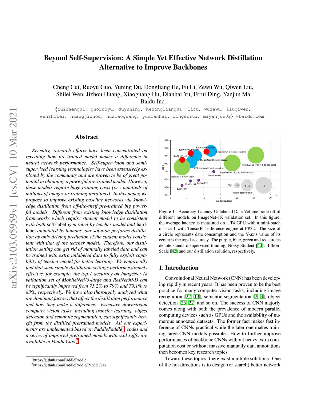 Recently, research efforts have been concentrated on revealing how pre-trained model makes a difference in neural network performance. Self-supervision and semi-supervised learning technologies have been extensively explored by the community and are proven to be of great potential in obtaining a powerful pre-trained model. However, these models require huge training costs (i.e., hundreds of millions of images or training iterations). In this paper, we propose to improve existing baseline networks via knowledge distillation from off-the-shelf pre-trained big powerful models. Different from existing knowledge distillation frameworks which require student model to be consistent with both soft-label generated by teacher model and hard-label annotated by humans, our solution performs distillation by only driving prediction of the student model consistent with that of the teacher model. Therefore, our distillation setting can get rid of manually labeled data and can be trained with extra unlabeled data to fully exploit capability of teacher model for better learning. We empirically find that such simple distillation settings perform extremely effective, for example, the top-1 accuracy on ImageNet-1k validation set of MobileNetV3-large and ResNet50-D can be significantly improved from 75.2% to 79% and 79.1% to 83%, respectively. We have also thoroughly analyzed what are dominant factors that affect the distillation performance and how they make a difference. Extensive downstream computer vision tasks, including transfer learning, object detection and semantic segmentation, can significantly benefit from the distilled pretrained models. All our experiments are implemented based on PaddlePaddle, codes and a series of improved pretrained models with ssld suffix are available in PaddleClas.