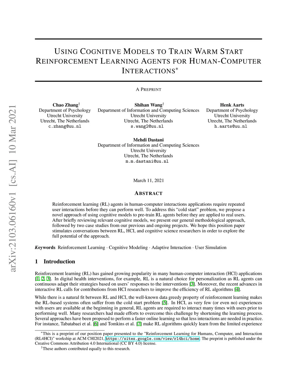 Reinforcement learning (RL) agents in human-computer interactions applications require repeated user interactions before they can perform well. To address this "cold start" problem, we propose a novel approach of using cognitive models to pre-train RL agents before they are applied to real users. After briefly reviewing relevant cognitive models, we present our general methodological approach, followed by two case studies from our previous and ongoing projects. We hope this position paper stimulates conversations between RL, HCI, and cognitive science researchers in order to explore the full potential of the approach.