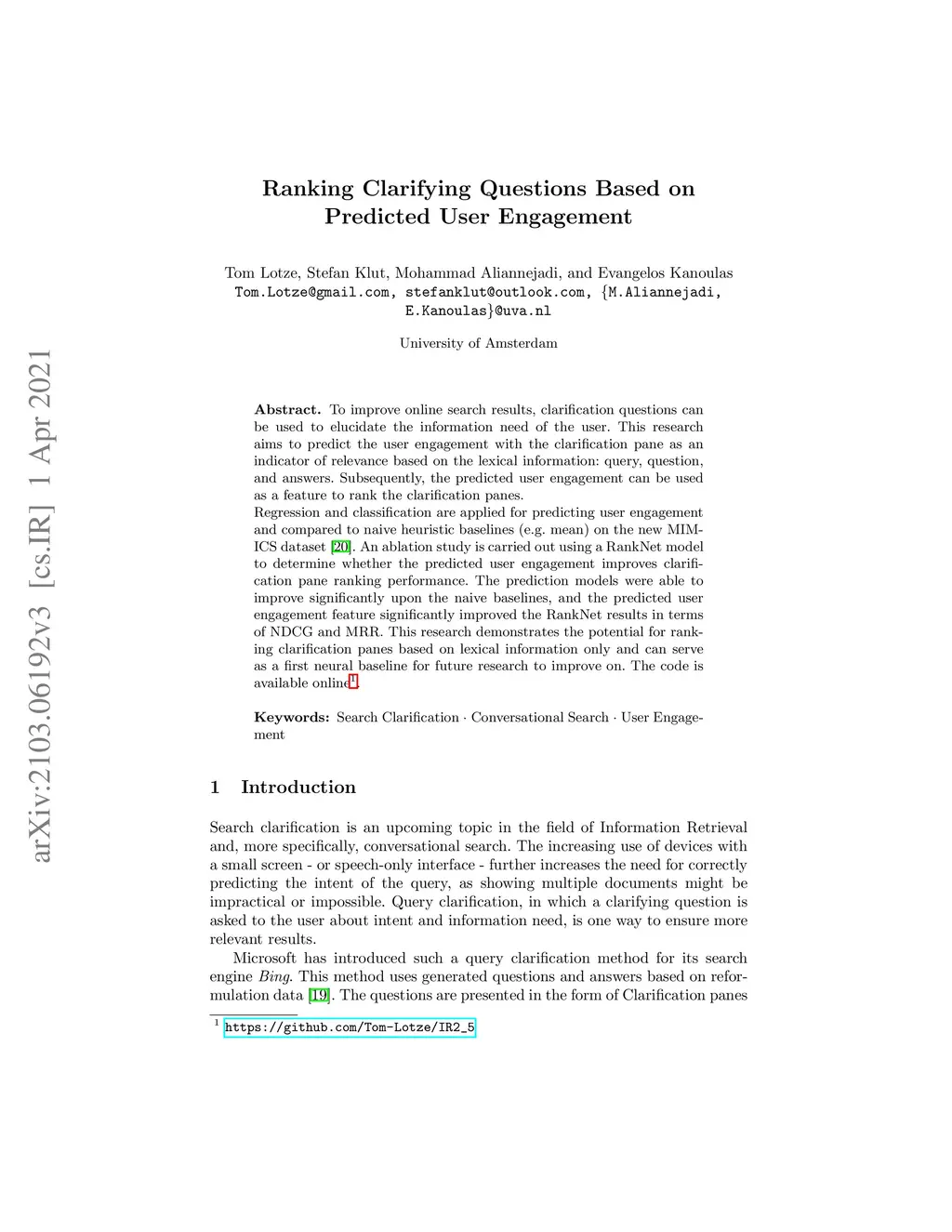 Ranking Clarifying Questions Based on Predicted User Engagement