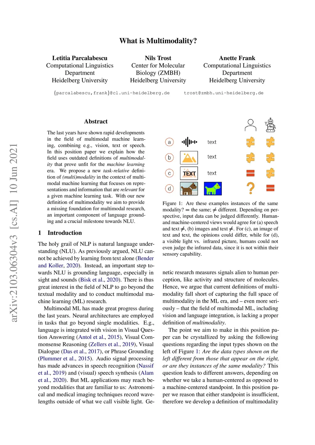 The last years have shown rapid developments in the field of multimodal machine learning, combining e.g., vision, text or speech. In this position paper we explain how the field uses outdated definitions of multimodality that prove unfit for the machine learning era. We propose a new task-relative definition of (multi)modality in the context of multimodal machine learning that focuses on representations and information that are relevant for a given machine learning task. With our new definition of multimodality we aim to provide a missing foundation for multimodal research, an important component of language grounding and a crucial milestone towards NLU.