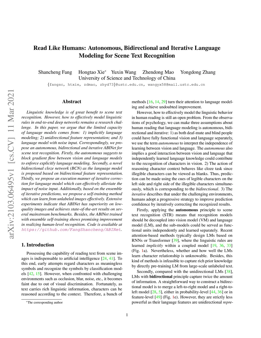 Linguistic knowledge is of great benefit to scene text recognition. However, how to effectively model linguistic rules in end-to-end deep networks remains a research challenge. In this paper, we argue that the limited capacity of language models comes from: 1) implicitly language modeling; 2) unidirectional feature representation; and 3) language model with noise input. Correspondingly, we propose an autonomous, bidirectional and iterative ABINet for scene text recognition. Firstly, the autonomous suggests to block gradient flow between vision and language models to enforce explicitly language modeling. Secondly, a novel bidirectional cloze network (BCN) as the language model is proposed based on bidirectional feature representation. Thirdly, we propose an execution manner of iterative correction for language model which can effectively alleviate the impact of noise input. Additionally, based on the ensemble of iterative predictions, we propose a self-training method which can learn from unlabeled images effectively. Extensive experiments indicate that ABINet has superiority on low-quality images and achieves state-of-the-art results on several mainstream benchmarks. Besides, the ABINet trained with ensemble self-training shows promising improvement in realizing human-level recognition. Code is available at https://github.com/FangShancheng/ABINet.