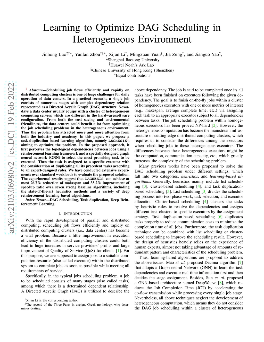 Learning to Optimize DAG Scheduling in Heterogeneous Environment