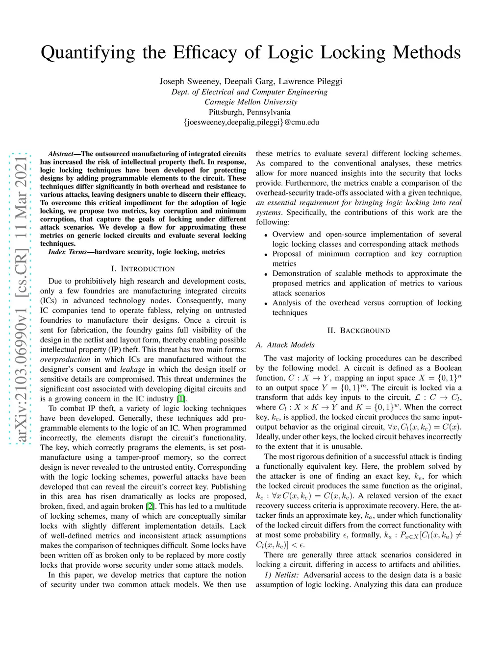 The outsourced manufacturing of integrated circuits has increased the risk of intellectual property theft. In response, logic locking techniques have been developed for protecting designs by adding programmable elements to the circuit. These techniques differ significantly in both overhead and resistance to various attacks, leaving designers unable to discern their efficacy. To overcome this critical impediment for the adoption of logic locking, we propose two metrics, key corruption and minimum corruption, that capture the goals of locking under different attack scenarios. We develop a flow for approximating these metrics on generic locked circuits and evaluate several locking techniques.