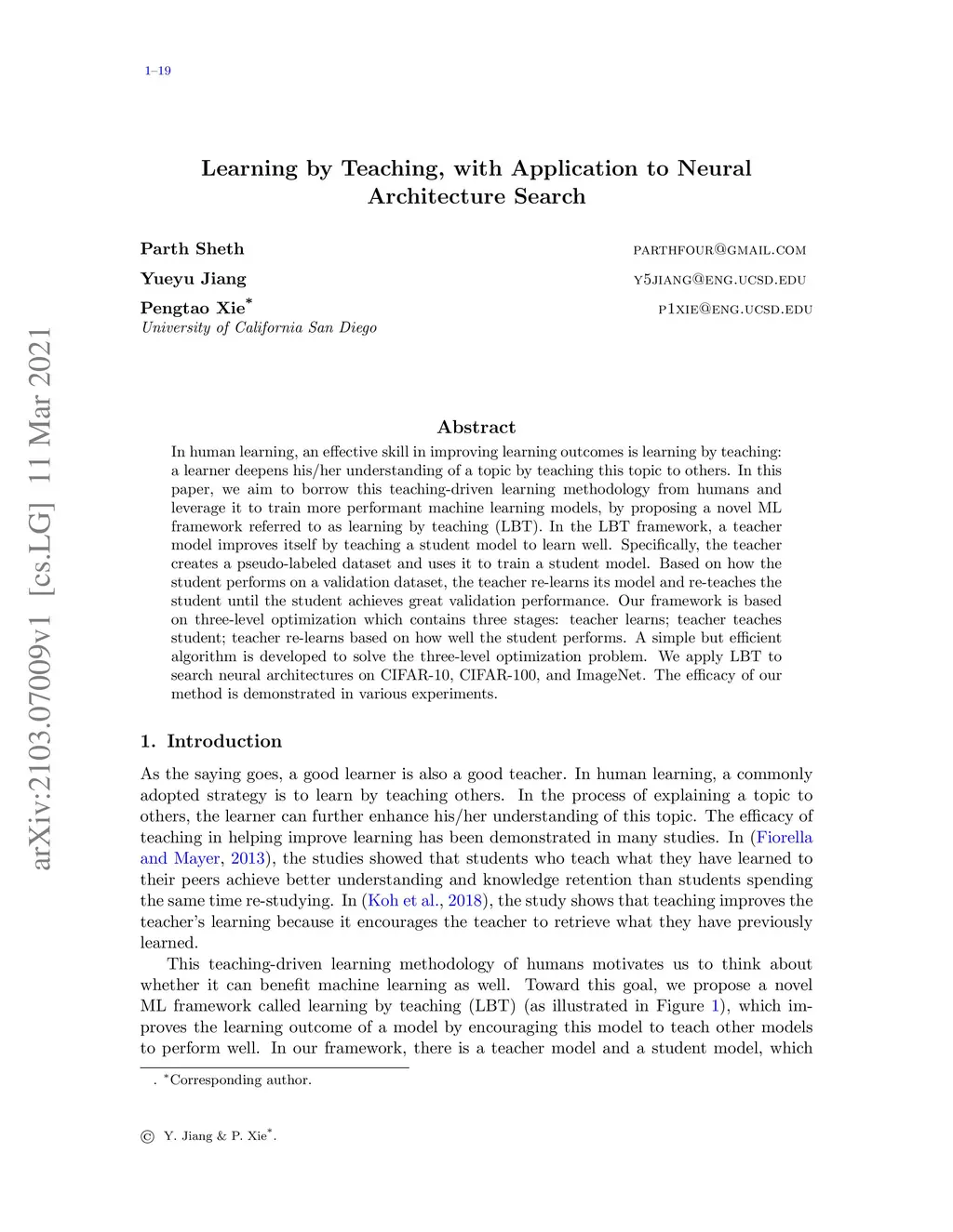 In human learning, an effective skill in improving learning outcomes is learning by teaching: a learner deepens his/her understanding of a topic by teaching this topic to others. In this paper, we aim to borrow this teaching-driven learning methodology from humans and leverage it to train more performant machine learning models, by proposing a novel ML framework referred to as learning by teaching (LBT). In the LBT framework, a teacher model improves itself by teaching a student model to learn well. Specifically, the teacher creates a pseudo-labeled dataset and uses it to train a student model. Based on how the student performs on a validation dataset, the teacher re-learns its model and re-teaches the student until the student achieves great validation performance. Our framework is based on three-level optimization which contains three stages: teacher learns; teacher teaches student; teacher re-learns based on how well the student performs. A simple but efficient algorithm is developed to solve the three-level optimization problem. We apply LBT to search neural architectures on CIFAR-10, CIFAR-100, and ImageNet. The efficacy of our method is demonstrated in various experiments.