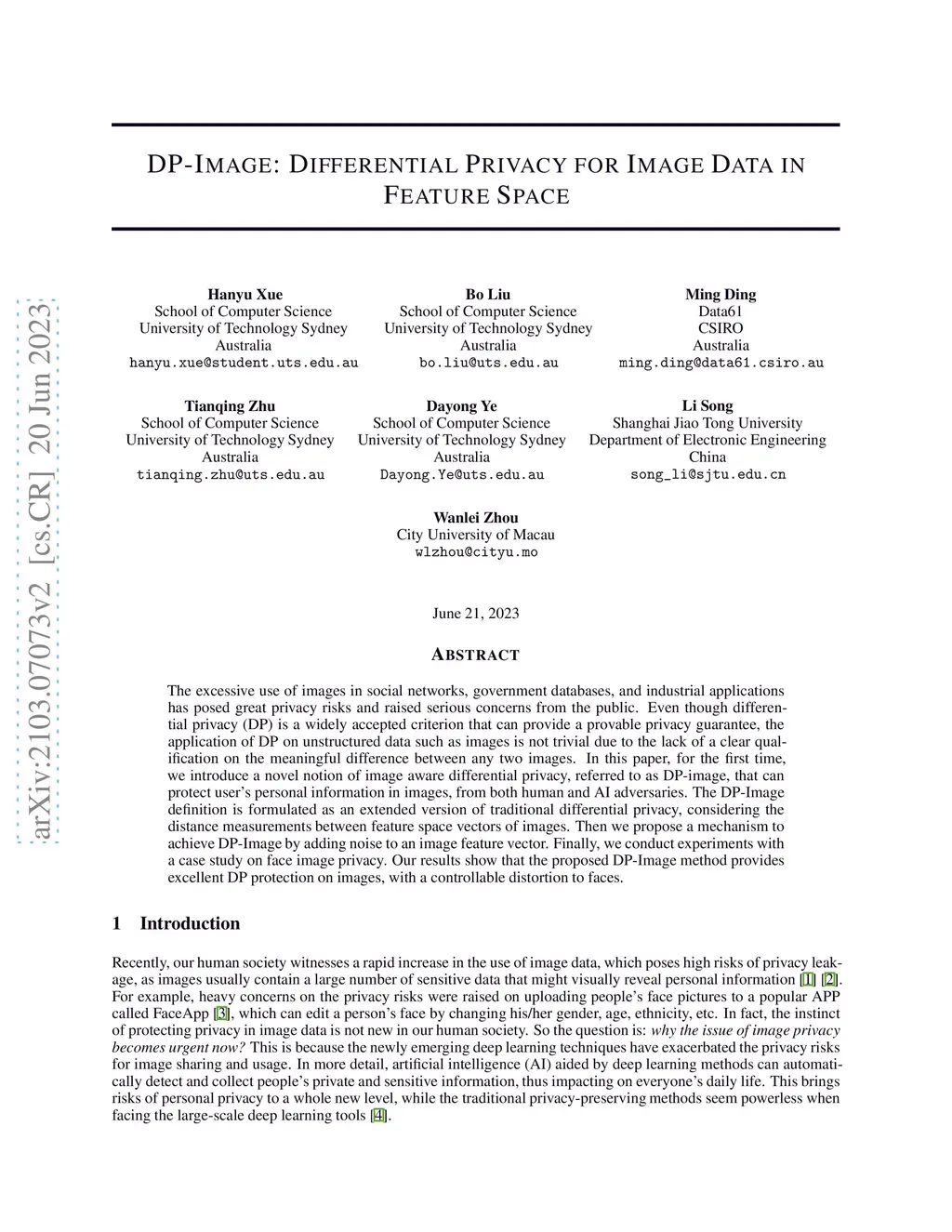 DP-Image: Differential Privacy for Image Data in Feature Space