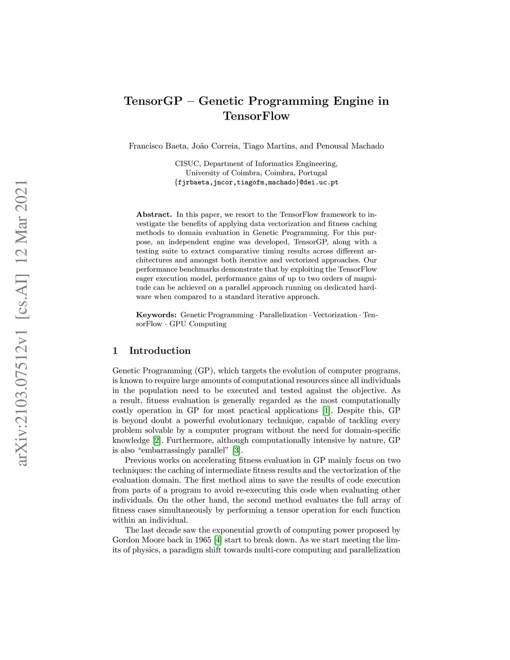 In this paper, we resort to the TensorFlow framework to investigate the benefits of applying data vectorization and fitness caching methods to domain evaluation in Genetic Programming. For this purpose, an independent engine was developed, TensorGP, along with a testing suite to extract comparative timing results across different architectures and amongst both iterative and vectorized approaches. Our performance benchmarks demonstrate that by exploiting the TensorFlow eager execution model, performance gains of up to two orders of magnitude can be achieved on a parallel approach running on dedicated hardware when compared to a standard iterative approach.