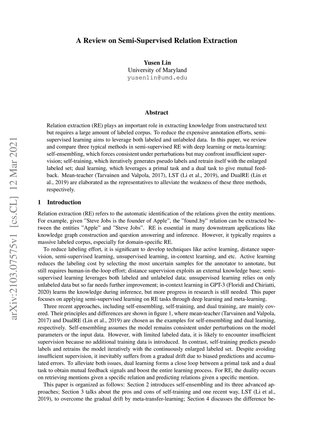 A Review on Semi-Supervised Relation Extraction