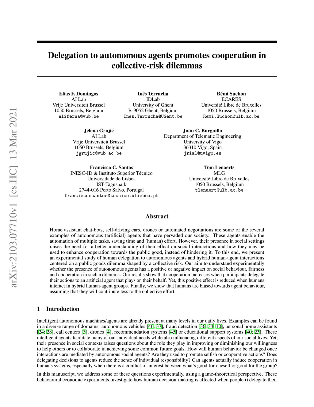 Home assistant chat-bots, self-driving cars, drones or automated negotiations are some of the several examples of autonomous (artificial) agents that have pervaded our society. These agents enable the automation of multiple tasks, saving time and (human) effort. However, their presence in social settings raises the need for a better understanding of their effect on social interactions and how they may be used to enhance cooperation towards the public good, instead of hindering it. To this end, we present an experimental study of human delegation to autonomous agents and hybrid human-agent interactions centered on a public goods dilemma shaped by a collective risk. Our aim to understand experimentally whether the presence of autonomous agents has a positive or negative impact on social behaviour, fairness and cooperation in such a dilemma. Our results show that cooperation increases when participants delegate their actions to an artificial agent that plays on their behalf. Yet, this positive effect is reduced when humans interact in hybrid human-agent groups. Finally, we show that humans are biased towards agent behaviour, assuming that they will contribute less to the collective effort.
