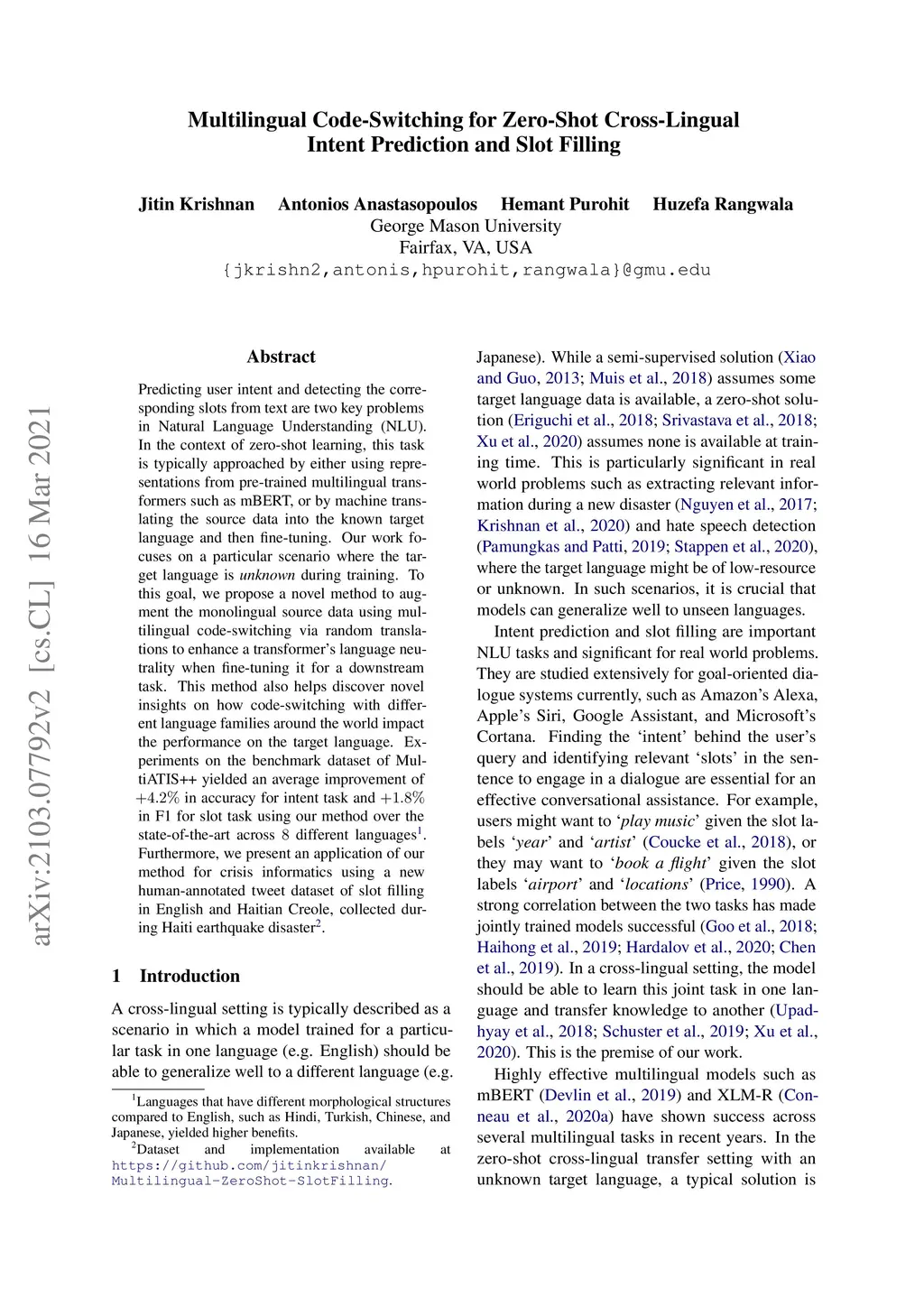 Predicting user intent and detecting the corresponding slots from text are two key problems in Natural Language Understanding (NLU). In the context of zero-shot learning, this task is typically approached by either using representations from pre-trained multilingual transformers such as mBERT, or by machine translating the source data into the known target language and then fine-tuning. Our work focuses on a particular scenario where the target language is unknown during training. To this goal, we propose a novel method to augment the monolingual source data using multilingual code-switching via random translations to enhance a transformer's language neutrality when fine-tuning it for a downstream task. This method also helps discover novel insights on how code-switching with different language families around the world impact the performance on the target language. Experiments on the benchmark dataset of MultiATIS++ yielded an average improvement of +4.2% in accuracy for intent task and +1.8% in F1 for slot task using our method over the state-of-the-art across 8 different languages. Furthermore, we present an application of our method for crisis informatics using a new human-annotated tweet dataset of slot filling in English and Haitian Creole, collected during Haiti earthquake disaster.