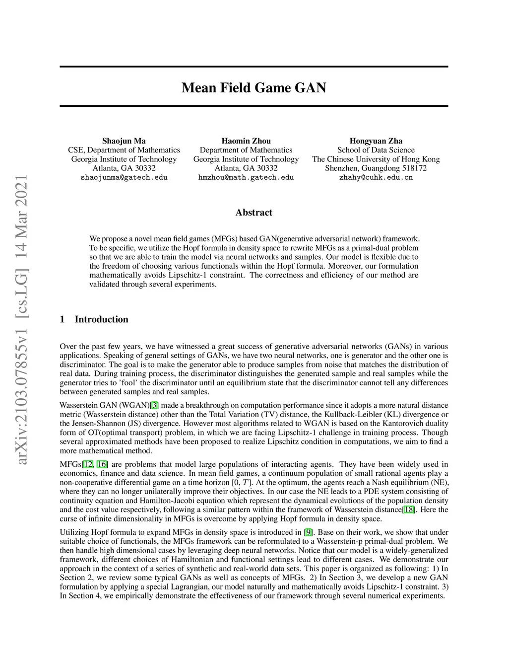 Mean Field Game GAN