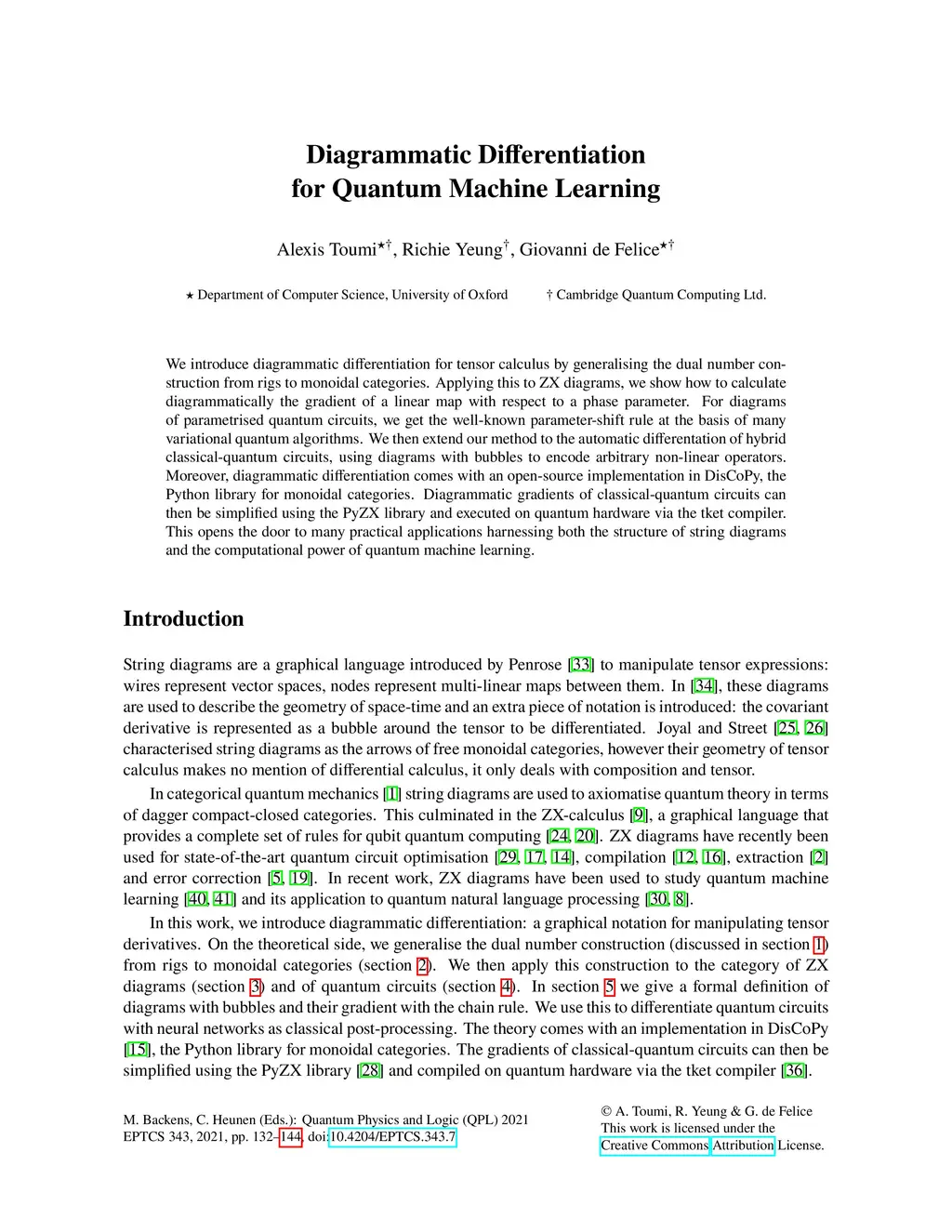 We introduce diagrammatic differentiation for tensor calculus by generalising the dual number construction from rigs to monoidal categories. Applying this to ZX diagrams, we show how to calculate diagrammatically the gradient of a linear map with respect to a phase parameter. For diagrams of parametrised quantum circuits, we get the well-known parameter-shift rule at the basis of many variational quantum algorithms. We then extend our method to the automatic differentation of hybrid classical-quantum circuits, using diagrams with bubbles to encode arbitrary non-linear operators. Moreover, diagrammatic differentiation comes with an open-source implementation in DisCoPy, the Python library for monoidal categories. Diagrammatic gradients of classical-quantum circuits can then be simplified using the PyZX library and executed on quantum hardware via the tket compiler. This opens the door to many practical applications harnessing both the structure of string diagrams and the computational power of quantum machine learning.